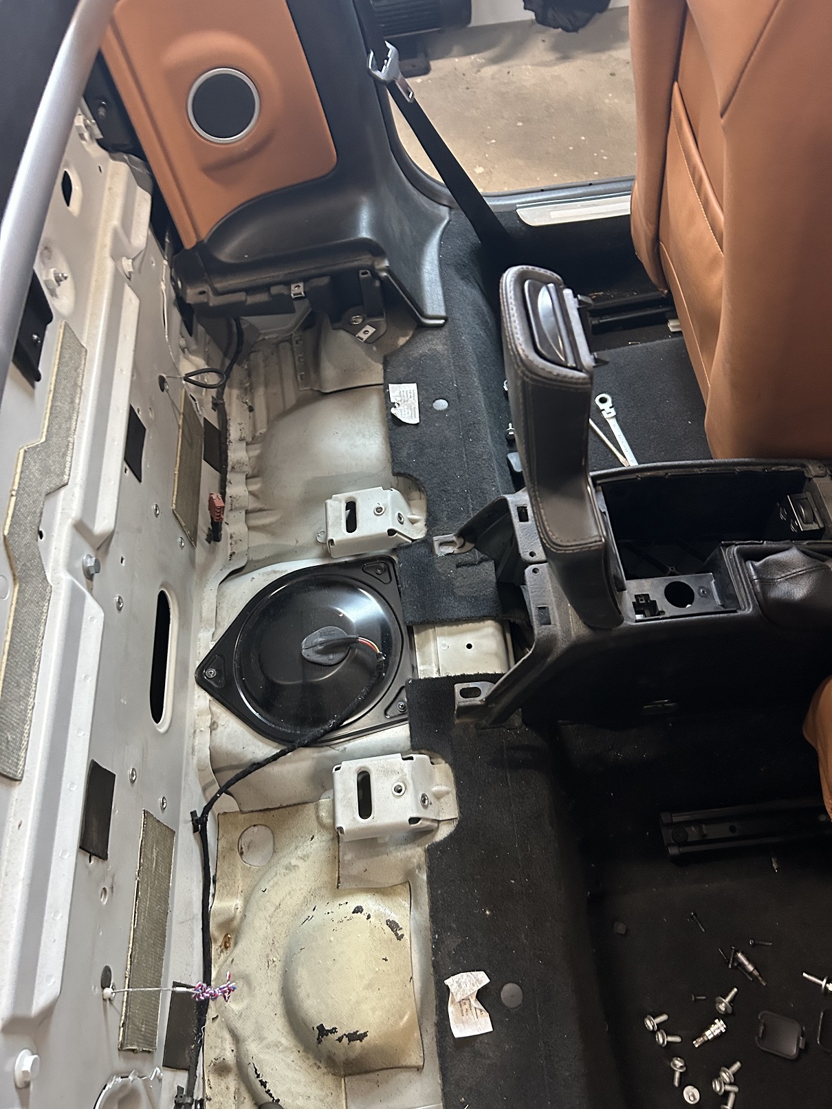 Tak je pod tou lavicí. Problém je vyndat reprák BOSE, kvůli tomu se musí vyndat celý středový tunel. A čerpadlo samozřejmě teče....