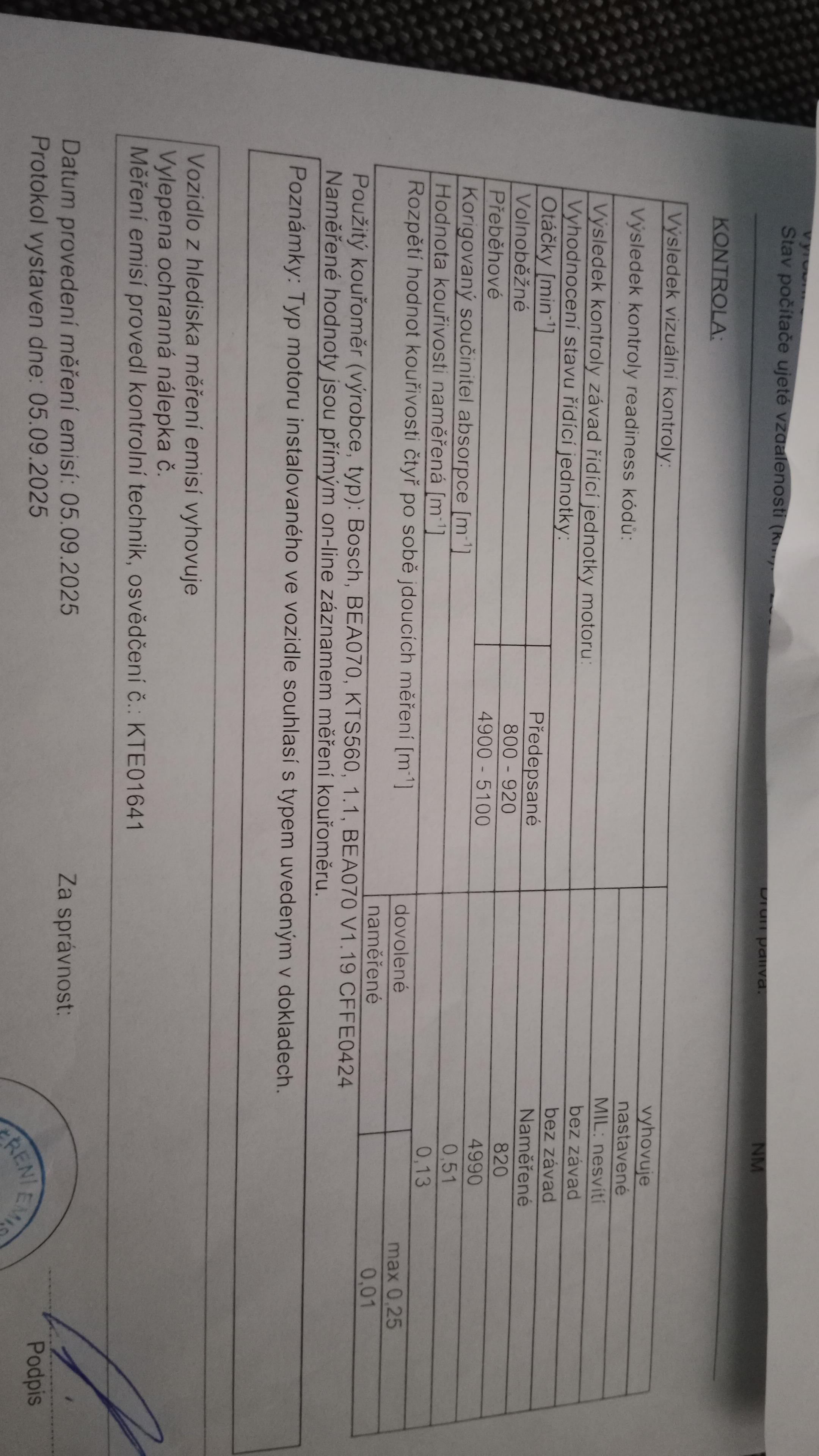 Tak dnes úspěšně další STK a emise a zase na 2 roky pokoj. Kouřivost 0,17. Prej je vidět, že dpf funguje, říkal technik