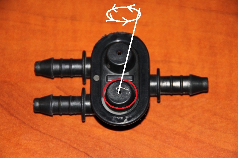 Ventil mi zřejmě zatuhl protože skoro nejezdím a navíc když už někam jedu, mám SDS, takže neostřikoval asi fakt dlouho. Musel jsem jej rozříznout(naznačeno červeně), abych přišel na závadu. Uvnitř je orezlej plíšek kolem gumového středu a pružinka. Plíšek zarezl natolik, že jej tlak neprotlačil. Po rozřezání jsem to jen rozchodil zadní stranou malého vrtáčku oškrábnutím zarezlého nánosu. Vrtáček by prolezl i tou dírkou, ale to jsem nevěděl co je uvnitř, takže jsem jej zbytečně dost poničil. Pokud by to někdo ještě řešil, tak jako první bych zkusil jen přes tu dírku (vrtáčkem nebo něčím podobným) pod úhlem zasunout a obkroužit(naznačeno bílou čárou) - je velká šance, že se to povolí a ventil ani nebude potřeba sundávat z hadic a řezat jako já.