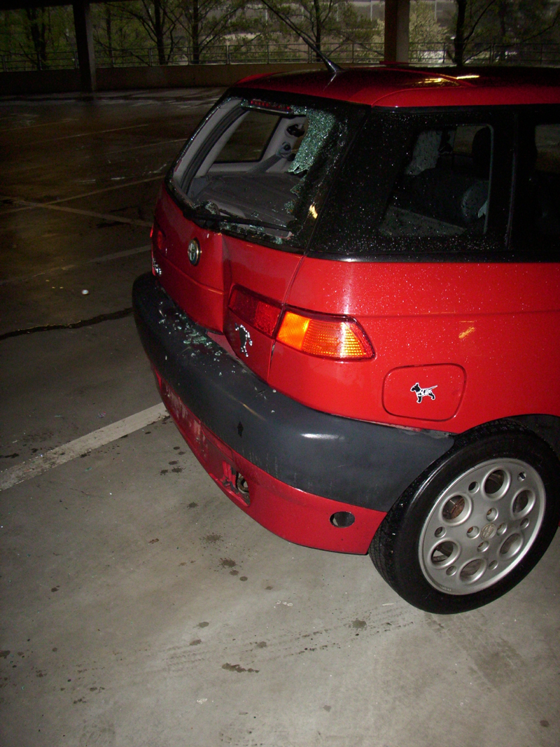 Tou černější kankou byl pak nepovedený couvací manévr jedné z Alfiček 145, jejíž řidič se potkal s jedním z pilířů a poškodil si tak třetí dveře, což i ostatním trochu pokazilo náladu, protože každej ví, jak taková záležitost znepříjemní život.