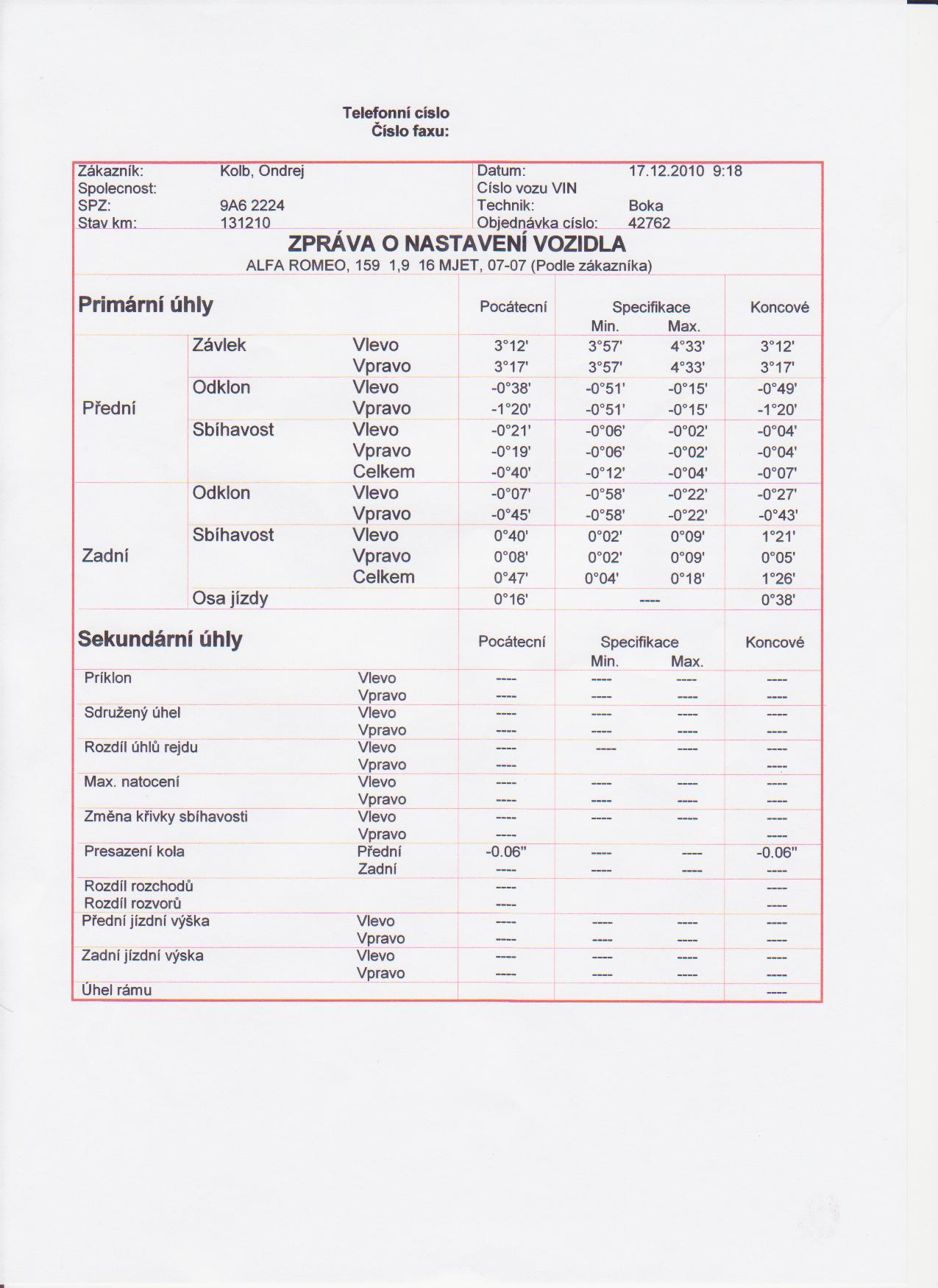Jinak alfinka byla na geometrii a odklon pravýho předního, záklon a sbíhavost levýho zadního mi přijdou uplně mimo. Spefikace +-sedí s tím co je v manuálu... Je možný, že to udělali tak blbě? Má někdo nějakou zkusenost popr. protokol z geometrie?