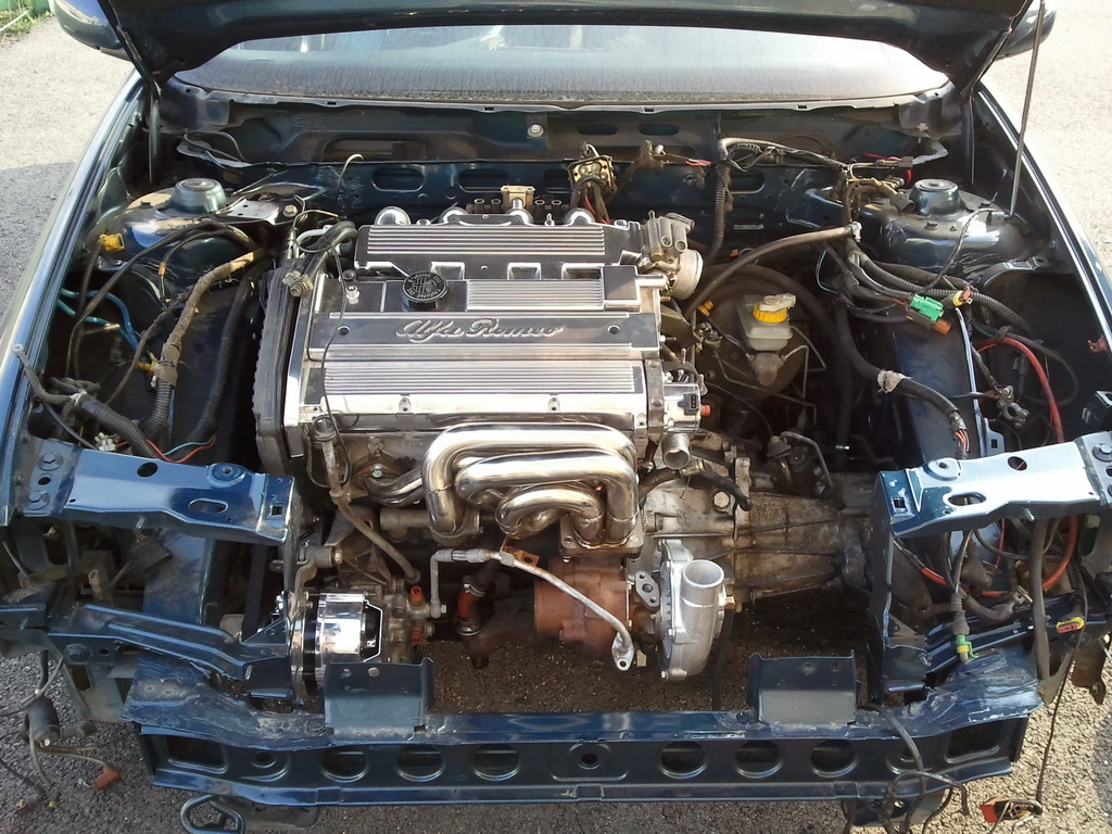 Co se týče montáže motoru, tak nebyl absolutně žádný problém.Všechny držáky z Coupe pasovaly i na Alfu. poloosy s kloubama pasovaly po obroušení "kroužků" na ABS které má Alfa nemá takže tam taky nebyl problém. Akorát je problém (jak jsem psal vyše) se světlou výškou která se blíží původni světlé výšce když byl v autě TS motor a to ještě není vše nastrojené... Proto jsem se rozhodl pro plně stavitelný podvozek.