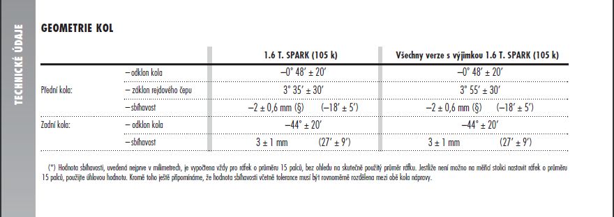 Já bych právě potřeboval veškerý tovární nastavení podvozku, sbíhavosti, odklony, záklony atd...Nechal jsem nastavit geometrii v nejmenovanym servisu a auto se mi chová ne jak alfa, ale jak ochcávka...A ještě mi k tomu šikulové asi zapomněli zaaretovat volant, takže když jedu rovně, mám volant natočenej lehce doleva:-)...Opravdu kvalitně odvedená práce technika:-)