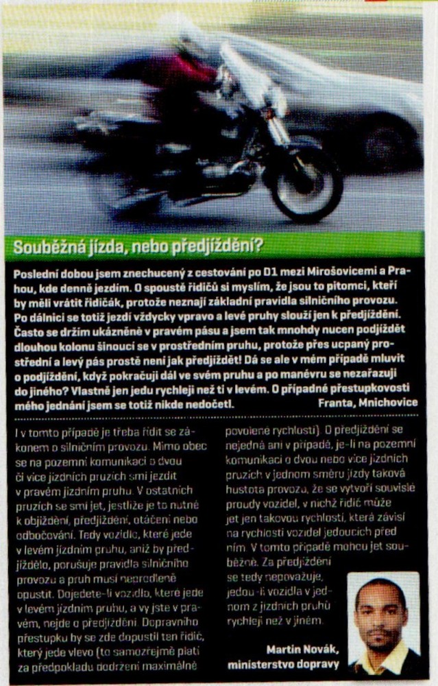 No tak to mě donedávna vytáčelo, když jsem jel a někdo mě brzdil v levém pruhu, když byl pravý volný, ale už jsem si na to zvyk, protože takových idiotů je požehnaně. Ve městě ještě nad tím mávnu rukou, ale co když vyjíždím z města a blbeček s peugeotem 106 nechce uhnout do pravého pruhu ani za boha i když blikám, to je teprv něco a stává se mi to deno denně a i když se nesmí předjíždět jsem k tomu mnohdy nucen, protože málokdo vám z toho levého uhne a nedokáže pochopit že 2,4 jede líp než nějaká jedenáctistovka a přijde mu to potupné uhnout rychlejším. Na to by se měla policie zaměřit, protože to je teda u nás v Opavě úplně normální. Stalo se mi už i několikrát že jsem se blížil k autu předemnou a hodím blinkr a předjíždím a magor mi začne kličkovat a nechce mě pustit.