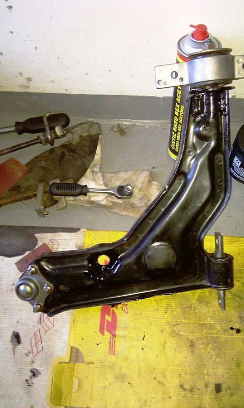 Nový spodní čep, silenbloky ramene, čep řízení, uložení a táhlo s uložením stabilizátoru, manžeta tlumiče, doraz. Během práce vše (i v okolí a odatmtud dostupné) očistěno, co bylo potřeba natřeno a nakonzervováno. Nakonec tedy zůstalo původní jen horní uložení (má prasklinu, ale nic fatálního a na ty km co to ještě najezdí to stačí [hlavně nový stojí nesmysl]), spodní McP ložisko (bylo naprosto OK) a samotný tlumič (taky bez známky potíží). Takže to samé mě teď čeká na druhé straně. Tam to ale půjde mnohem rychleji, díly už mám nakoupené a už mám zmáknutý technologický postup
