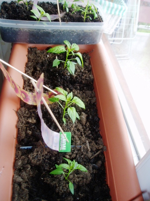 Jinak to u mne vypadá na "pozdní sběr". To napravo je kayenský pepř. Ten už půjde do kořenáčků. A truhlíček už mám připravený (samozřejmě půjde na venkovní stranu).