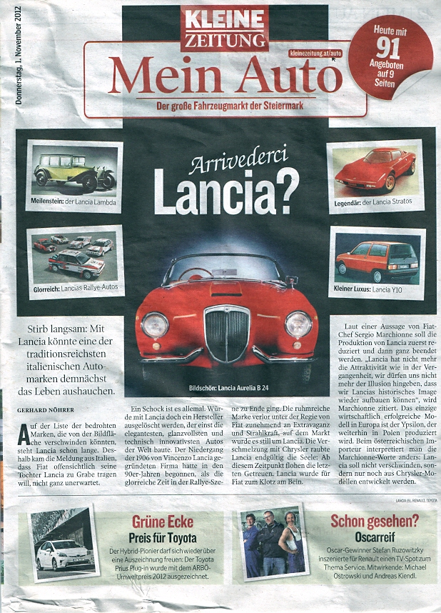 To že Lancia je odsouzena k umírání jsme věděli, ale teď co Marchionne dle rakouského tisku prohlásil: "Produkce Lancie bude redukována a pak zcela zastavena. Lancia už nemá tu atraktivitu z minulosti a je jen iluze si myslet, že by jsme Lancii její Image dokázali znovu vydobít", bude její smrt asi rychlejší