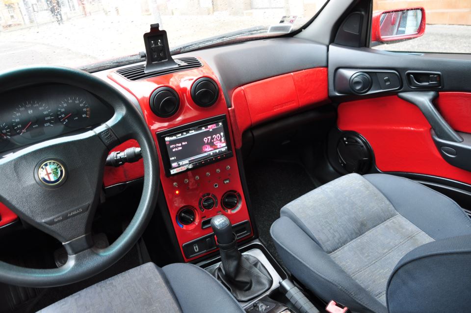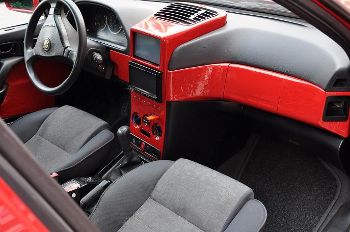 Popis interiéru:Zkrácená řadička o 7 cm. Upravený středový panel včetně posunutí regulátoru topení a nalakovaný do barvy ROSO zabudovaný 2din autorádio Pioneer AVH-P42OODDVD . Podsvícení změněno do červené barvy upravený tunel se zabudovaným 200A pojistným blokem, čalounění do červené barvy