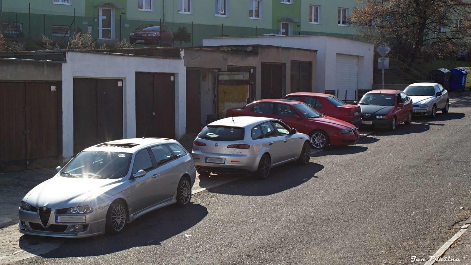 156 FL 2.5 V6 (kovárna), 159 2.4JTDm (lubo), 156 1.8TS (průža + v garáži schovaná 155 2.0TS 8v), 155 2.0TS 8v (já), 146 1.8TS a 156 2.4JTD, pak tedy ještě přijel Alfi166silver s 147.. :)