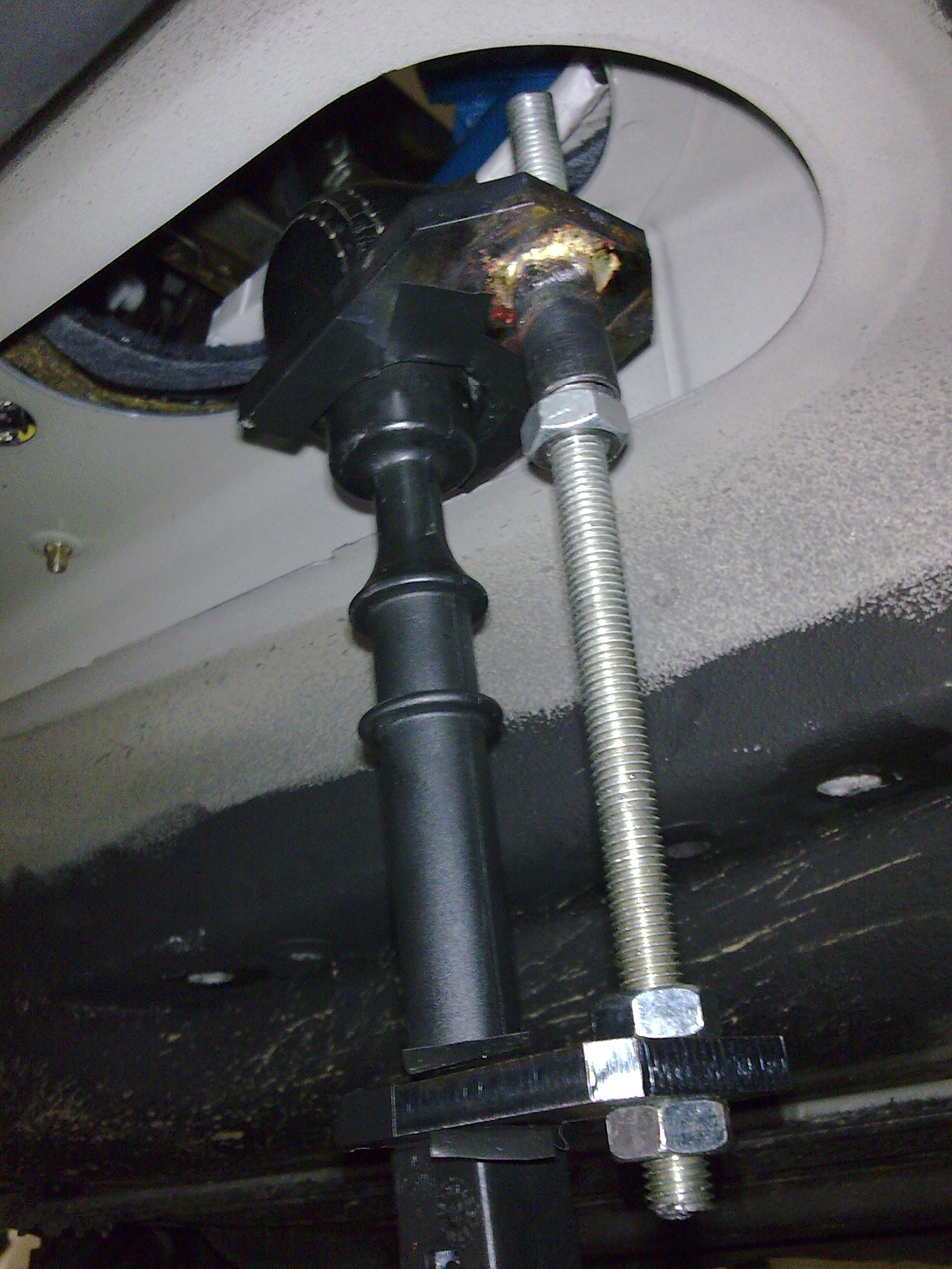 Cau, nic rezat nemusis. Stahout to jde v pohode jednoduchym stahovakem viz foto (je to foceny loni pod autem, proto tak divne zespodu). Muzes to normalne stahnout v kabine, jen sundas kozenou manzetu kolem. Ten stahovak si ale budes muset vyrobit. Nicmene koukam ze jsi z Prahy a protoze prazaci si maj pomahat, tak Ti ho muzu pujcit, se stahovakem je to job na 10 vterin a nic neznicis. Pisni mi soukromou zpravu a domluvime se.