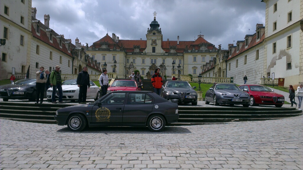 Setkani na parkovisti Videnky splnilo svuj ucel.Osobni kontakt po mesicich pro nektere a omrknuti zmen na milovanych Alfickach.Melancholicky destik a foceni vseho vsemi.Verejne hlaseni sefa srazu in natura z patra."Police" prijela seriozne vcas "just in time".Spanila jizda s doprovodem PČR byla zazitek.Pekne vykryvali kruhace a odbocky.Vyladene.Na zel.prejezdech nehrozil dlouhy cargo vlak.Vzpominka pri jizde na zel.oponu a hranicni pasmo.Valtice to musi byt klakson na turisty,vlajka vzhuru leti z okna deti,poza pred kamerou a finalni najizdeni na slecny u schodiste zamku.Vystup z autaku na promoceny pisek a dalsi zamecka historic promenada.Spolecna fotka od mistra a kavicka v kavarne v kruhu pratel.Poradne se procukrovat k dalsi kofeinove runde.Letacek s historii zamku-pruvodcem byl fajn.Finito zamku Valtice.Milanska vlajka cestou domu pekne vyschla a jeste se stihlo fandit Ferrari v legendarnim Monaku pri kvalifikaci.Dobra prace organizatore.Clovek to dokaze urcite ocenit ,pokud uz neco nekdy organizoval.Velký pán .. jo velký...