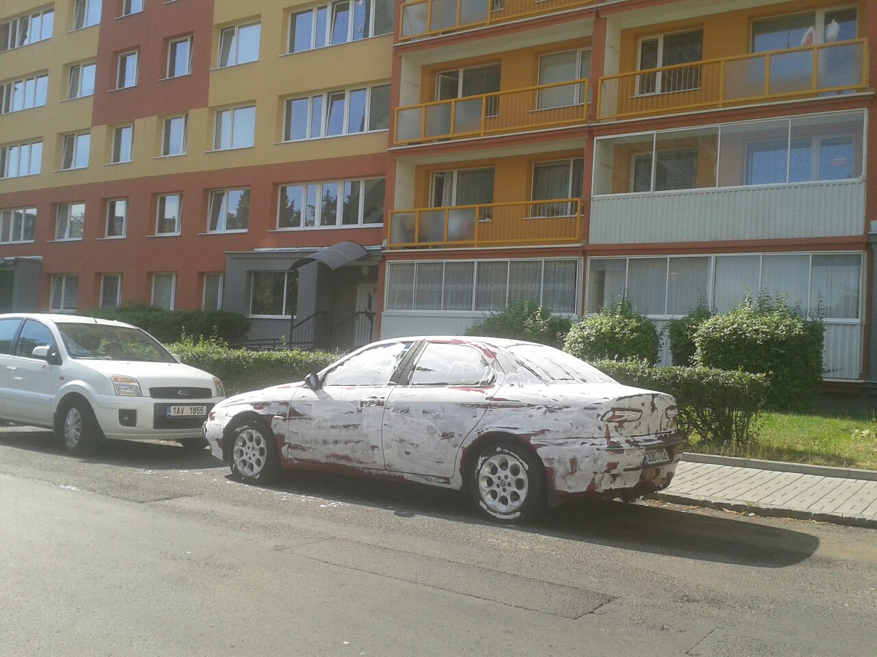 Tak info k nabarvené Alfě: Majitel nabarvené polepil svému kamarádovi, co má též 156, auto lepíkama, na to se kamarád jednoho večera ožral, chopil se válečku a bílé pokojové barvy a šel se pomstít..