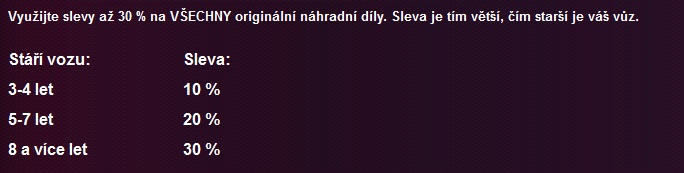 Třeba sleva na díly a autorizáku podle stáří auta: http://www.vernostsevyplaci.cz