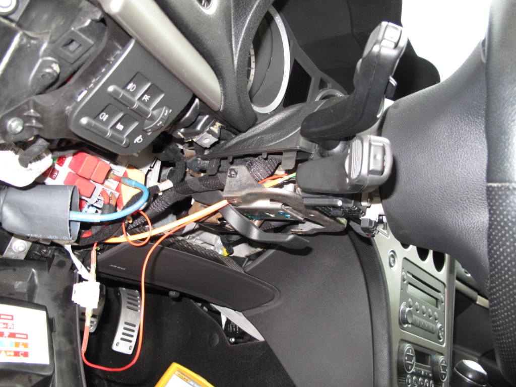 Úplně vlevo je konektor pro levé tlačítko volantu, prostřední konektor je klakson, vpravo v žluté bužírce je airbag. Ten modrý kroužek a z něho vybíhající žlutý kabel na airbag a černý do té další rozdvojky je shodný napříč verzemi výbav (je tam i příprava na Selespeed pádla atd.)