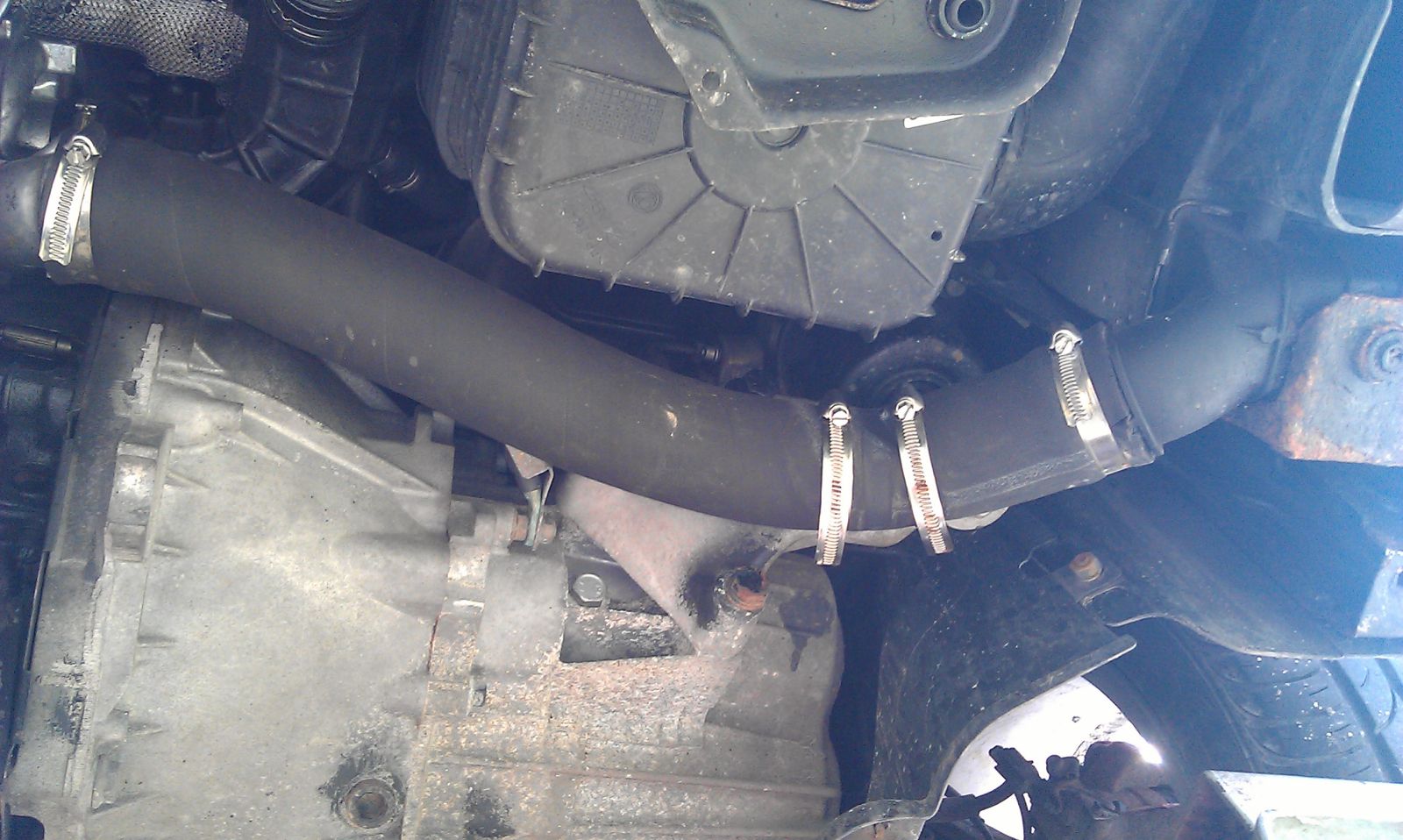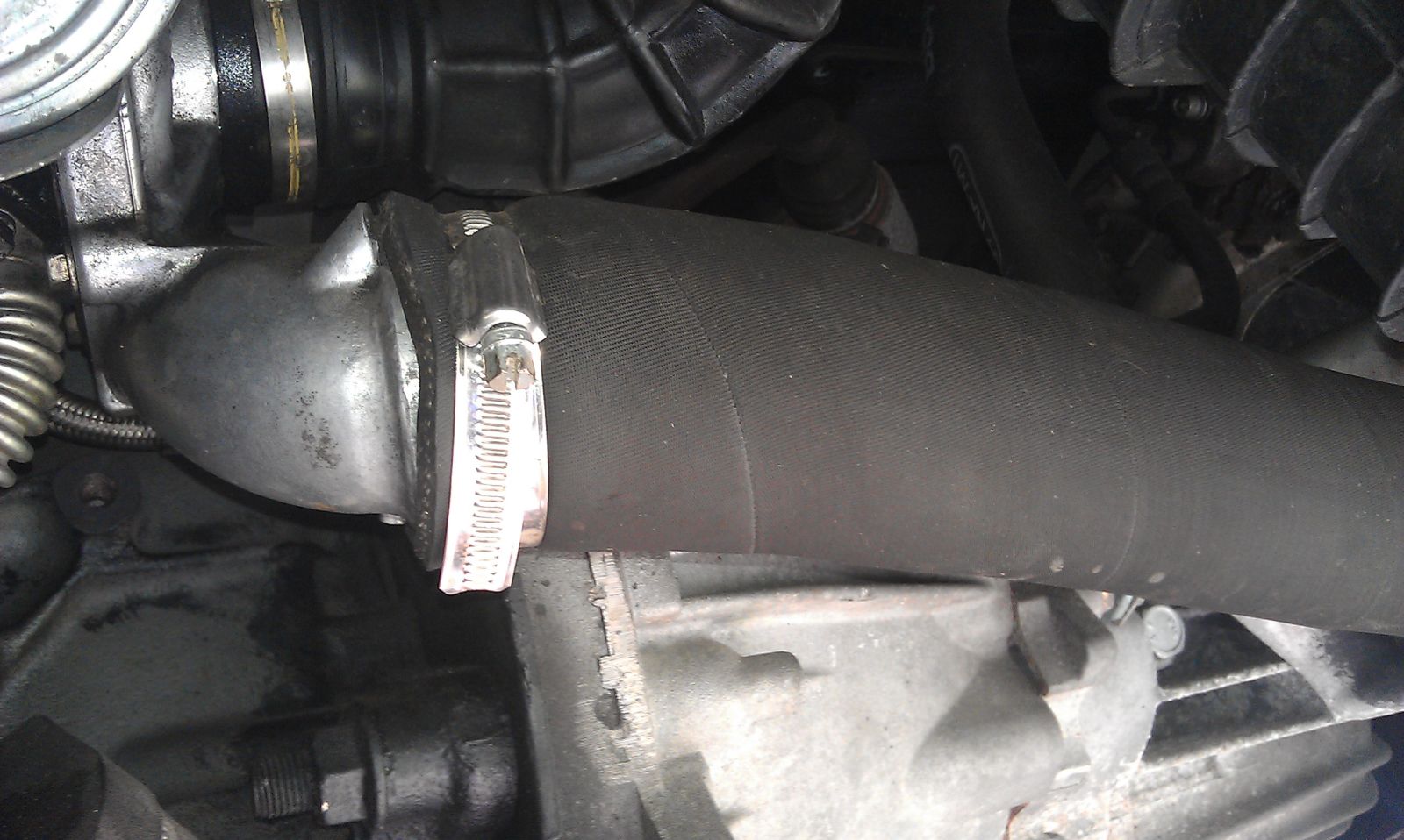 Hadice stála cca 150kč + spony. Je to 3x opláštěná hadice, tudíš tvrdší než originál... Fotky jsou cca po dvou letech provozu. Ty dvě spony