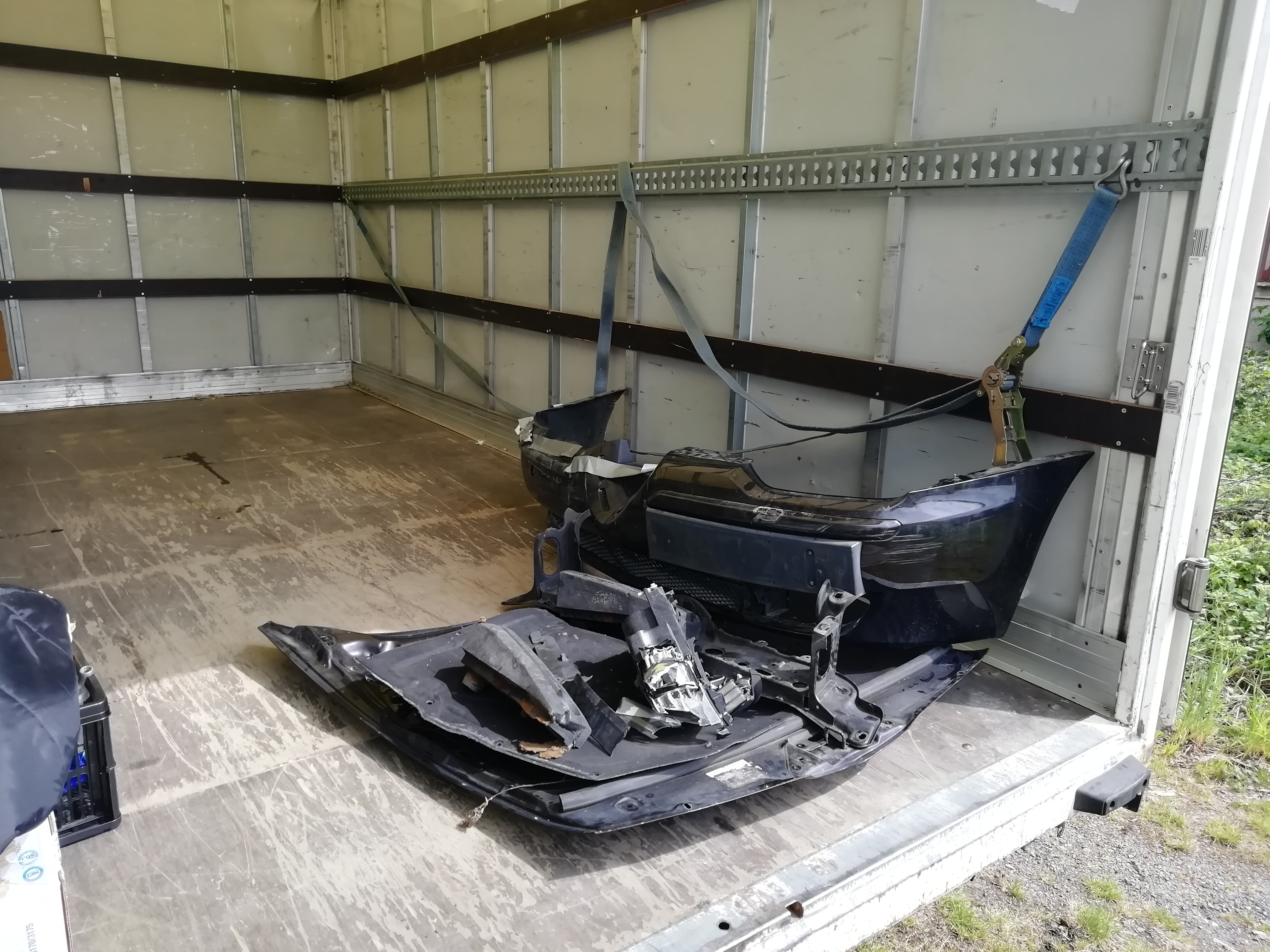 V sobotu jsem se k autu zase na chvíli dostal. Odstranil jsem všechny poškozené díly, které sundat šly a namontoval "novou" kapotu. Taky jsem k autu navozil téměř všechny náhradní díly. Teď už to vlastně čeká na klempíře, který musí vyměnit tu spodní poškozenou příčku. Tak shnilá je, protože už je z minulosti měněná a není to originální díl.