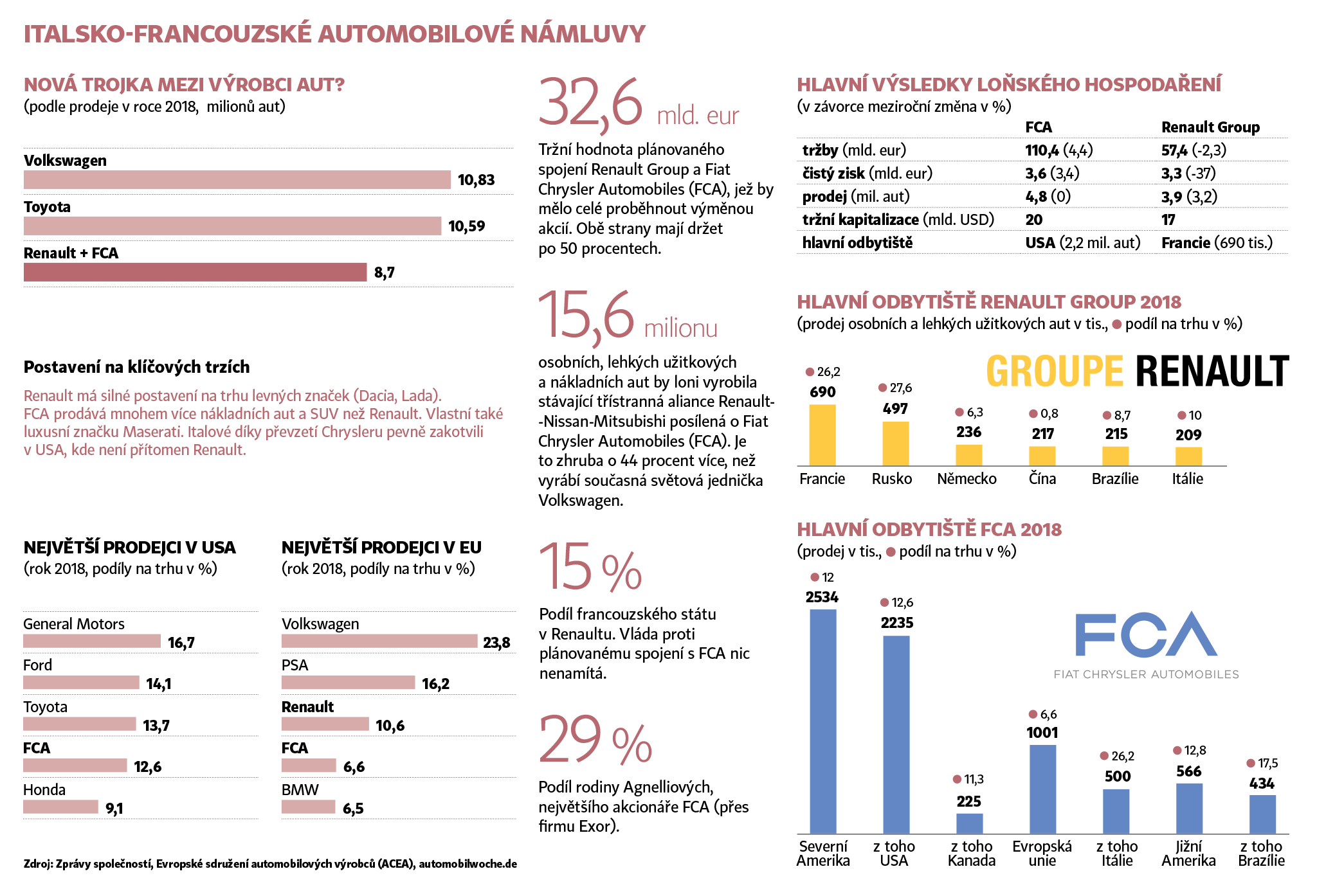 Dvě přední světové automobilky se mohou brzy sloučit v jednu. Italsko-americká firma Fiat Chrysler Automobiles (FCA) jedná o fúzi s francouzským Renaultem. Spojením by vznikl třetí největší výrobce automobilů na světě. S roční produkcí zhruba 8,7 milionu vozů by jej předčily pouze Volkswagen a Toyota. Společná firma by měla tržní hodnotu přesahující 35 miliard dolarů.