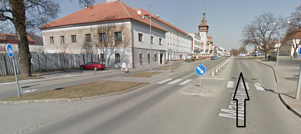 Např. jsem třetí od semaforu,jednoproudá ulice-pohled napravo=zábradlí,pohled nalevo=tramvajové koleje bez krytí(jsou vidět pražce)