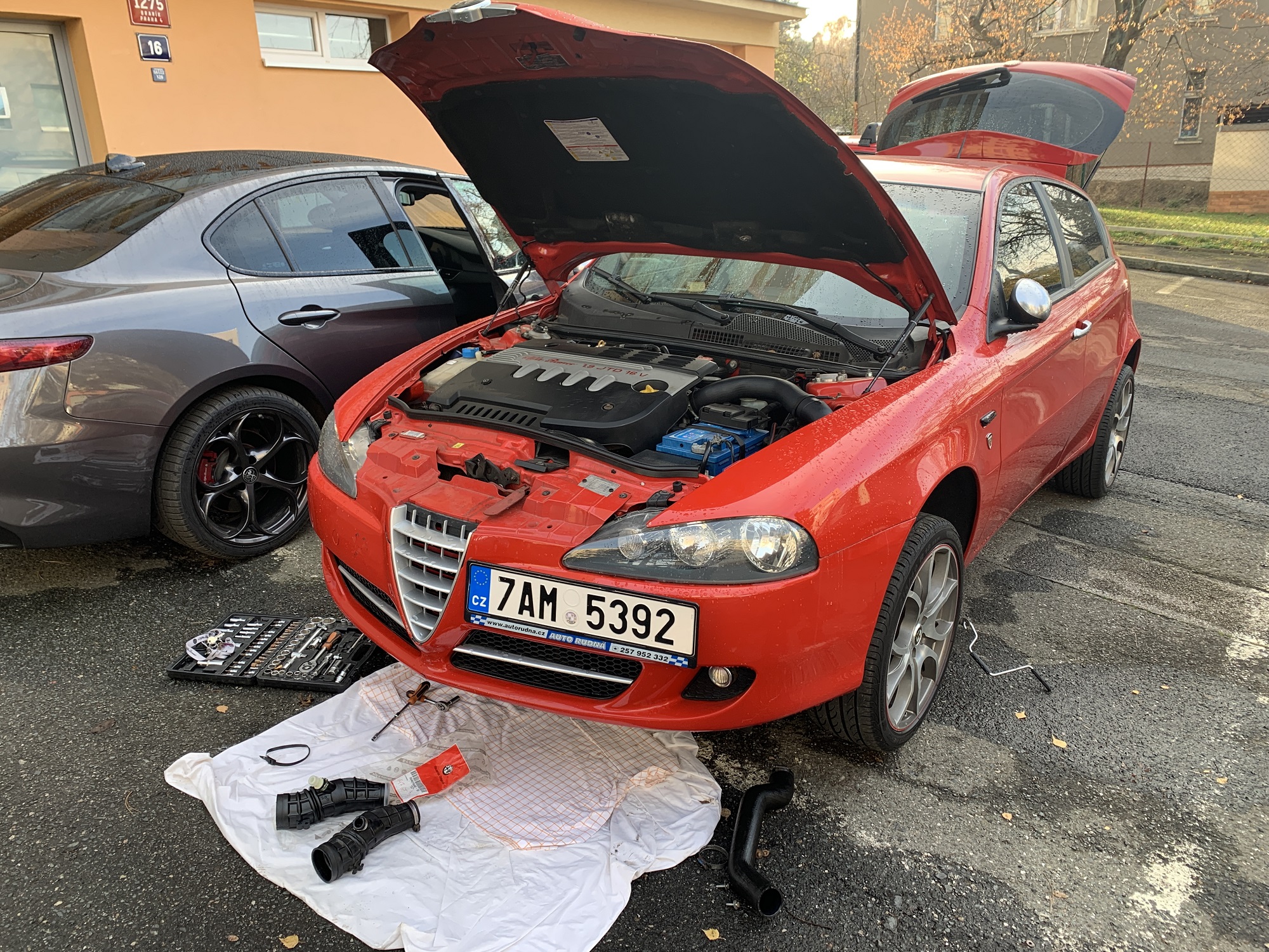 Můžu jen prozradit upgrade brzd na 330mm v předu a 276mm vzadu, bohužel mi ale před převozem dílů vykradli Giulii a tak jsem o veškerý material přišel včetně dalšího.. Pokus číslo dvě je ale zahájen