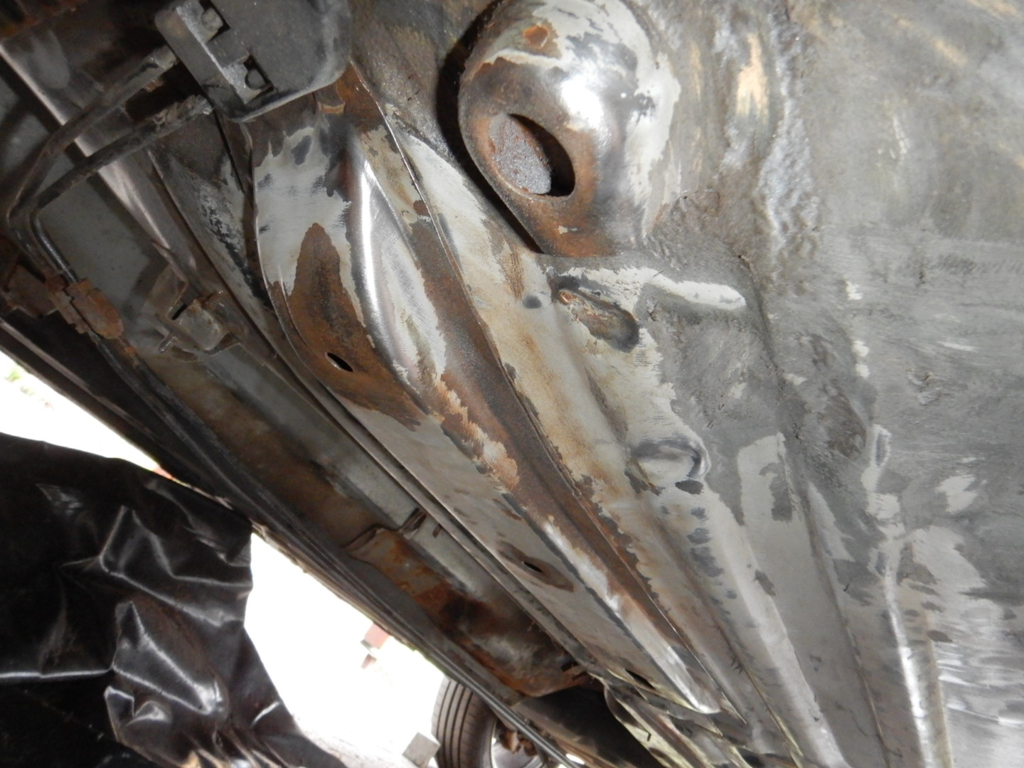 šroubovákem se mi povedlo vytvořit díry cca 2x2 cm s tím že okolí je hrachovina, tak se bude řezat... uvidíme jak moc.. nutnou plechařinu z nových dílů mám už doma (prahy, zadní lemy, držáky předních blatníků..)