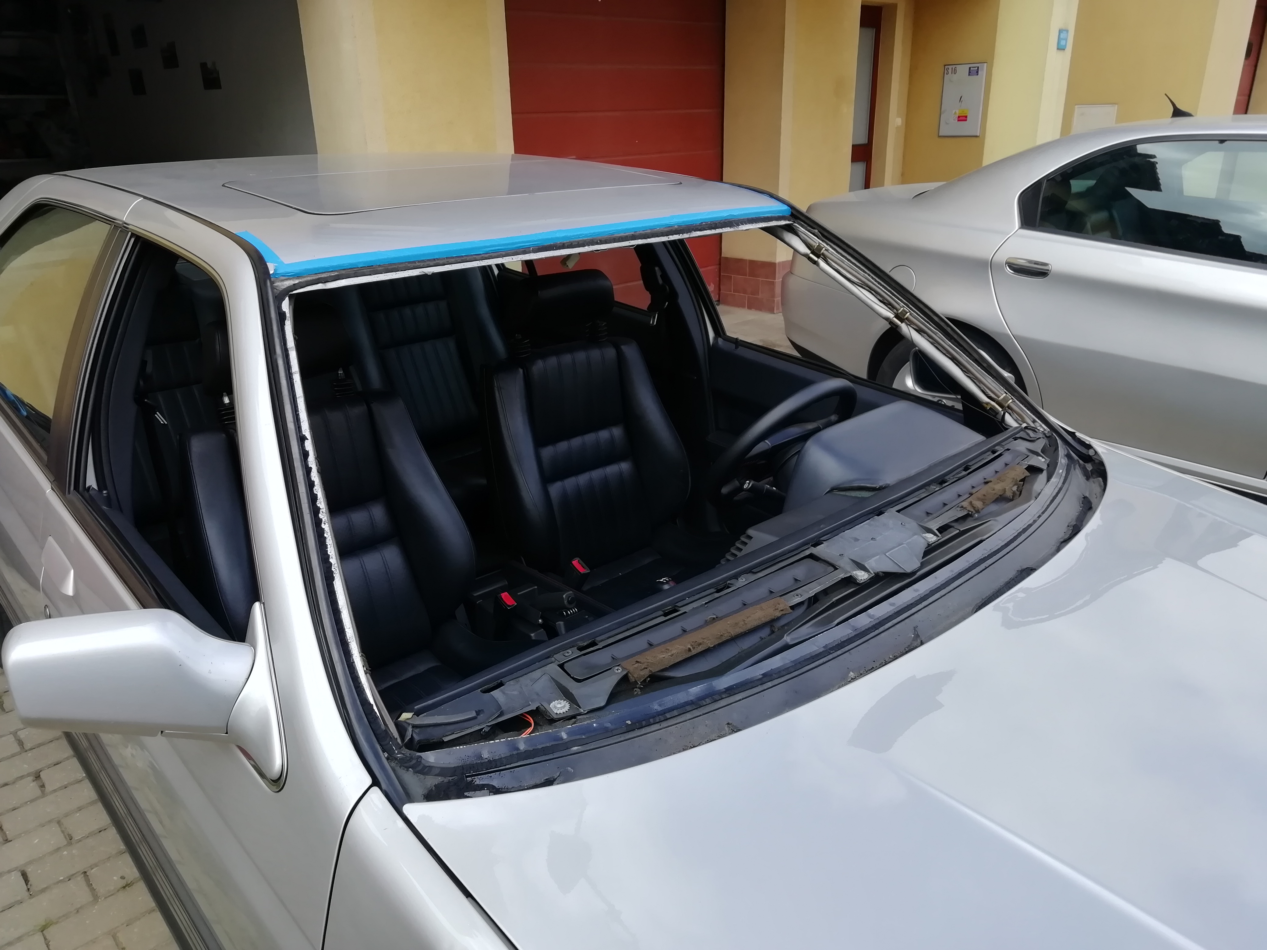V rámci příprav na vyříznutí čelního skla jsem demontoval stropnici a konečně ji opravil pořádně. Tzn. celou látku serval, odstranil drolící se molitan, vypral a znovu nalepil. Využiju toho i k další (už druhé) výměně šíbru, který mám jiný slíbený a bude snad zítra.