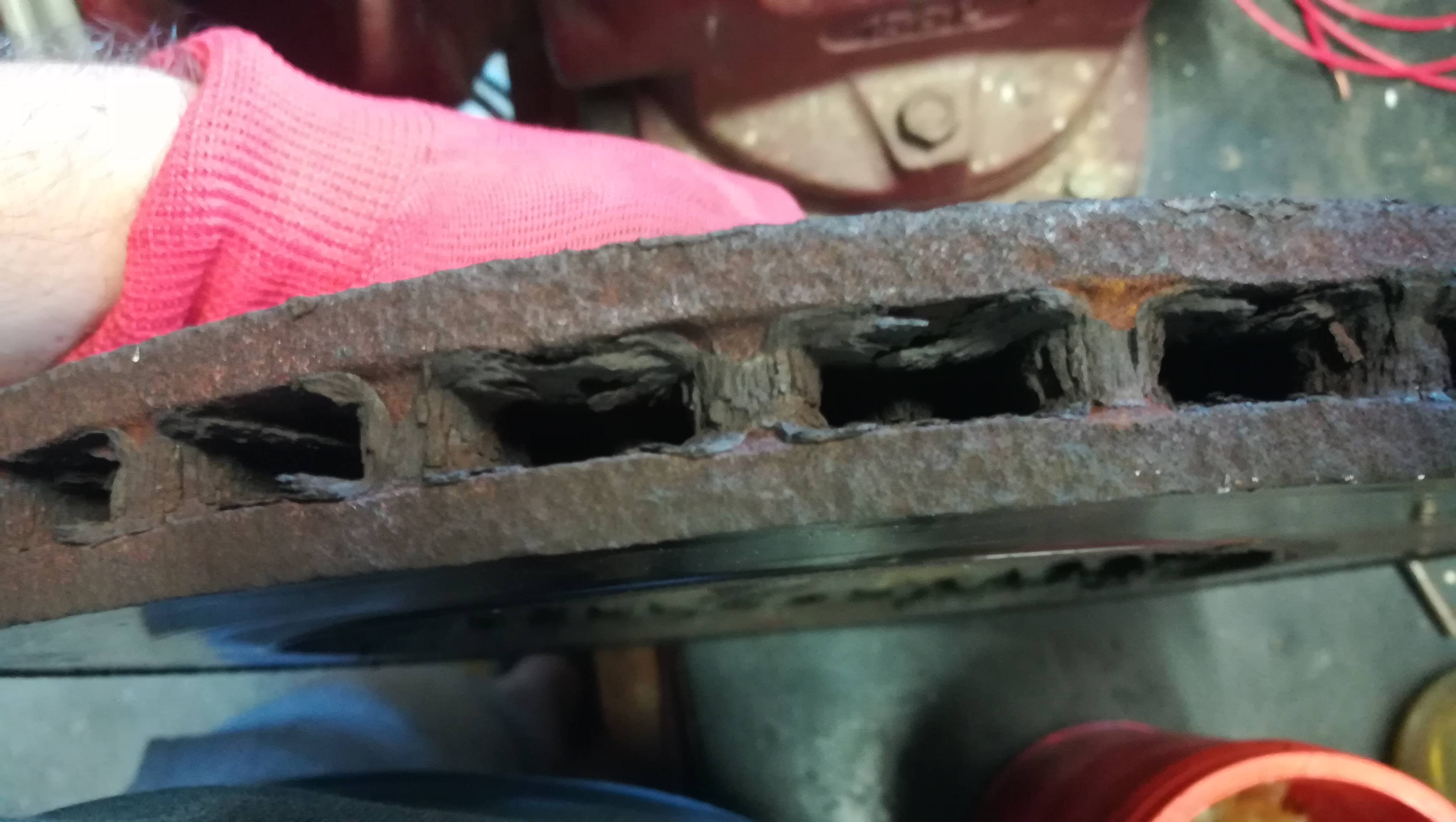 ad ten kotouč nahoře... vem šupleru, změř tloušťku (přes podložky, aby neměřil tu hranu) porovnej s doporučenejma rozměrama (nový/jetý/přesoustružený/na vyhození) a máš jasno ne? to že je rezavej.. vemu šroubovák, kladivo a co z tý rzi jde tak oklepu..