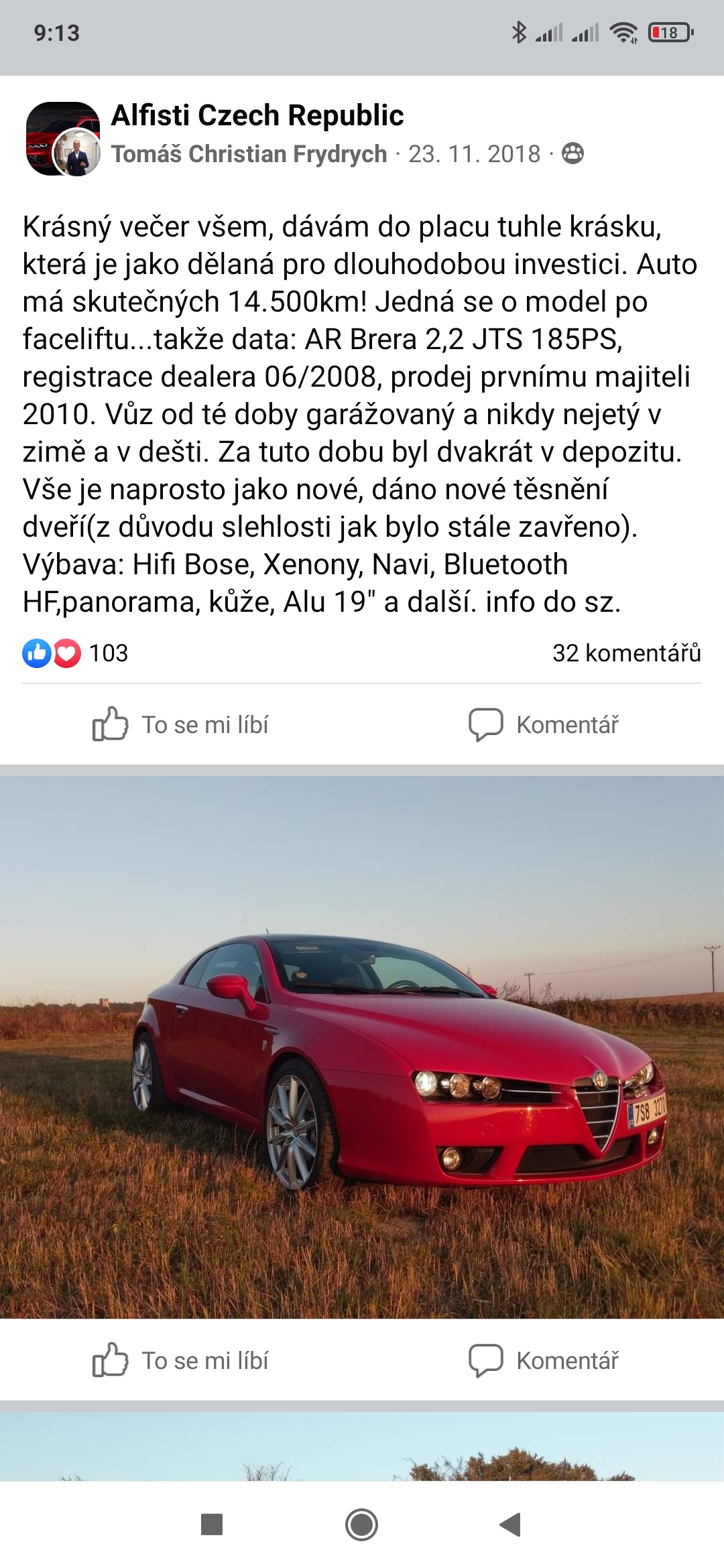 Zdravim, tak jsem tu bilou Breru koupil vcera. Pred asi 14ti dny jsem ji byl projet s chlapkem z Italmotori. Byla trochu bourana na levy predni naraznik, proto to lakovani, ale jinak nemel tomu autu po technicke strance co vytknout, mozna brzdove kotouce by se mely vymenit. Nasli jsme zminku o vymene rozvodu dvakrat, primo v prostoru motoru, myslim, ze obe jeste v Italii. Interier vypada velmi dobre, jede se s ni krasne, tak doufam, ze to vydrzi. Slevil mi na 214 z 219tis. Akorat jsem zjistil, ze tam dosla kapalina do ostrikovacu, tak ted maturuji, jak ji doplnit. Myslim, ze tady je nekde odkaz na navod v cestine, zkusim pohledat. Uz se tesim na nejaky srazik :-))) Jinak jsem si splnil sen a porad mi to nedochazi, ze mam svou vlastni Alfu, chtel jsem kdysi 159 a ted mam Breru! :-)) pritelkyne taky nadsena, nejdriv se ji nepozdaval prodej oktavky a koupe tohodle, ale videla, sedla a uverila... :-D