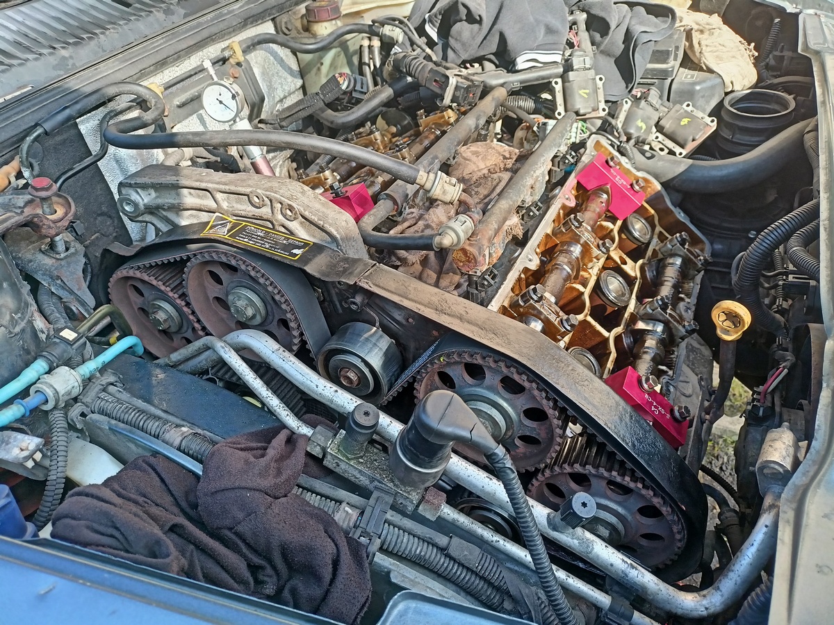 To jak ty přípravky sedí nebo nesedí je u tohoto motoru vcelku jedno, protože má na vačkách poměrně dost přesné rysky, takže ty přípravky tady slouží hlavně pro přidržení. Já mám na 2.5 přípravky z aliexpressu. Přišroubuji je, zkontroluji rysky a zda se vačky v těch přípravkách nemohou pohnout a je to.