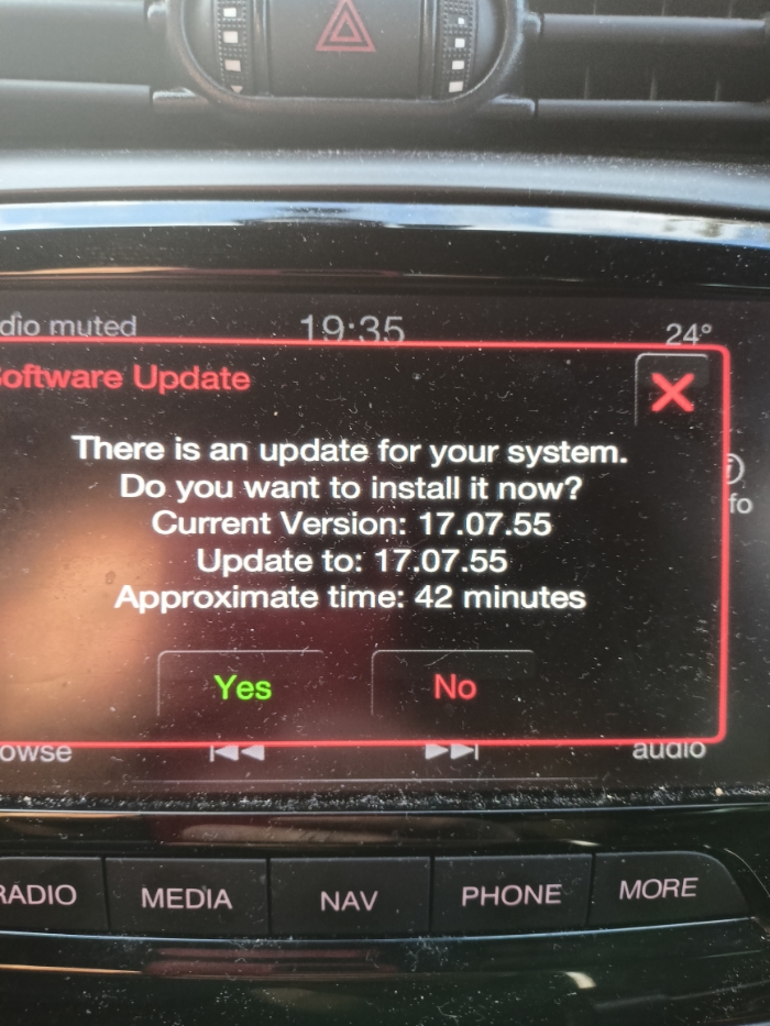 Pak jsem se pustil do té aktualizace map která trvala cca hoďku a na první pokus mi teda taky nevyšla, ale hned jsem dal po manuálním restartu rádia (současně RADIO + MORE + BROWSE/ENTER) pokus číslo 2 a ten už se vydařil. Na konci se objeví trošku matoucí hláška(viz. Foto), ale u ní dát NO. Rádio opět zrestartit a mapy už se rozběhly.