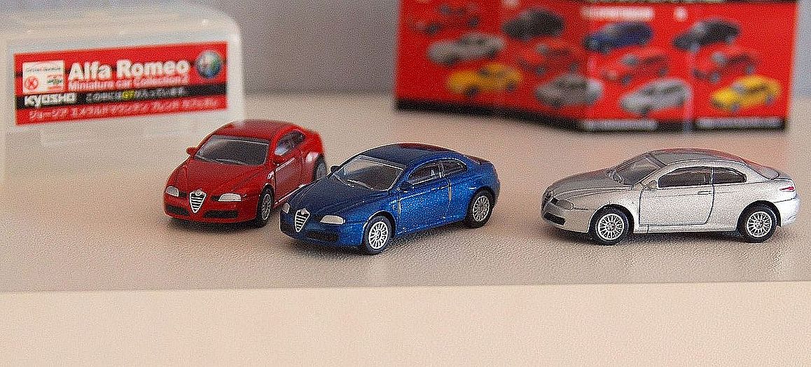 Nabízím exkluzívní miniaturní kovové modely Alfa Romeo - KYOSHO v měřítku 1/100 (cca 4cm). Samostatně neprodejné (pouze v Japonsku jako dárek k nápoji v roce 2009).
