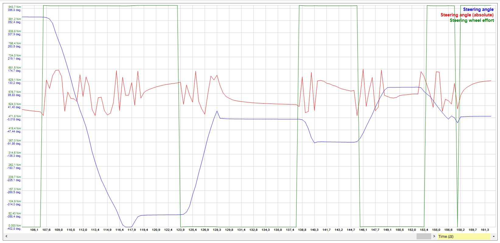 Za mě se mi zdá nekolik věcí špatně. Hodnota "steering wheel effort" je při točení volantu doleva v relativně správné hodnotě - kolem 2, 3 Nm. Při točení doprava vyletí na (imho nesmyslných) 900 a více Nm.