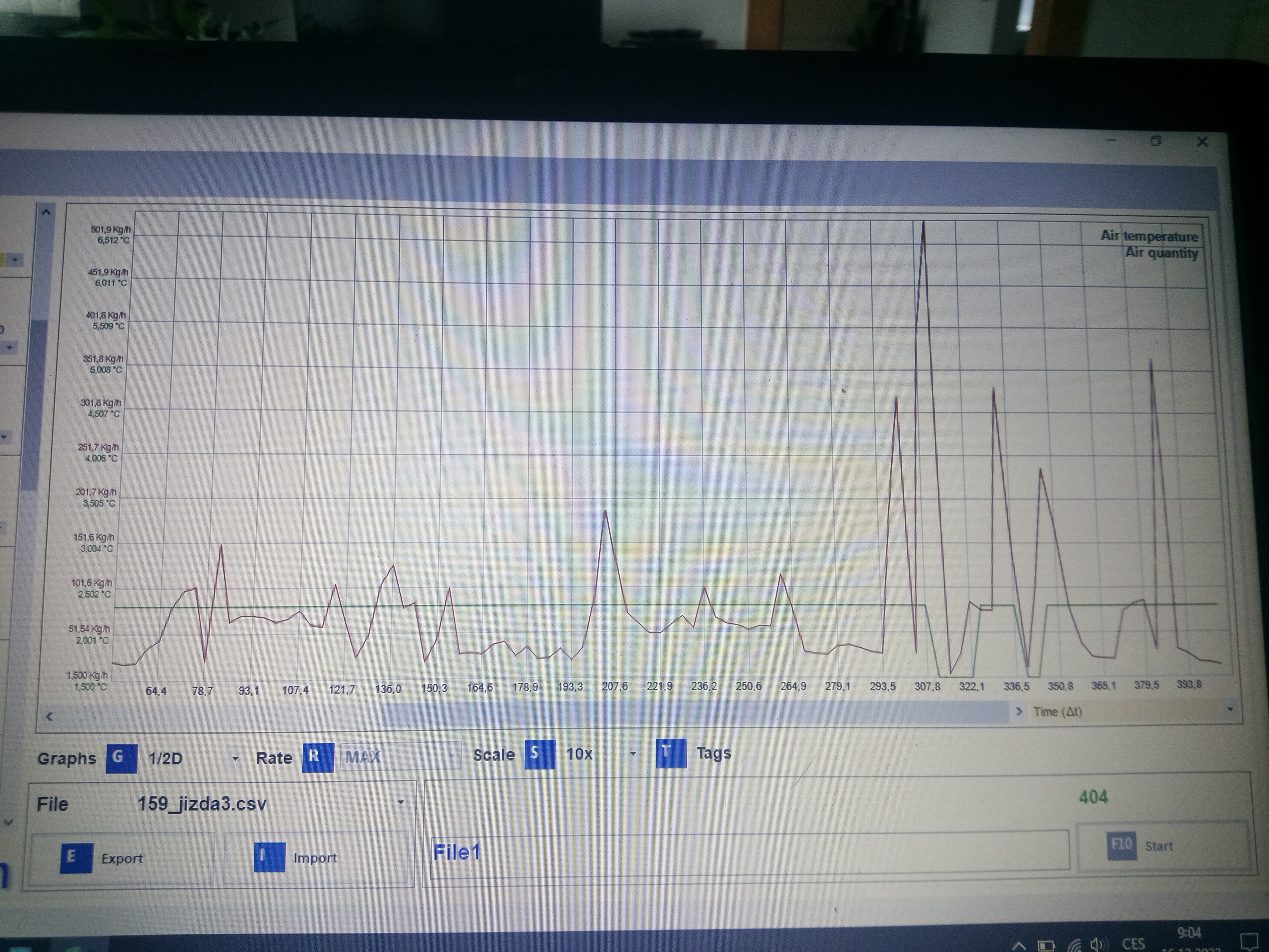 zaznam z mes, kdy se problem projevil me vede na kabelaz/konektor...ci kostru pro snimac teploty vzduchu nebo mnozstvi viz screen kdy skokove teplota spadne na 0 a to same mnozstvi vzduchu