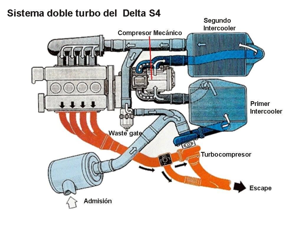 Hezké schéma dvojitého přeplňování turbokompresorem a kompresorem u Lancia Delta S4.
