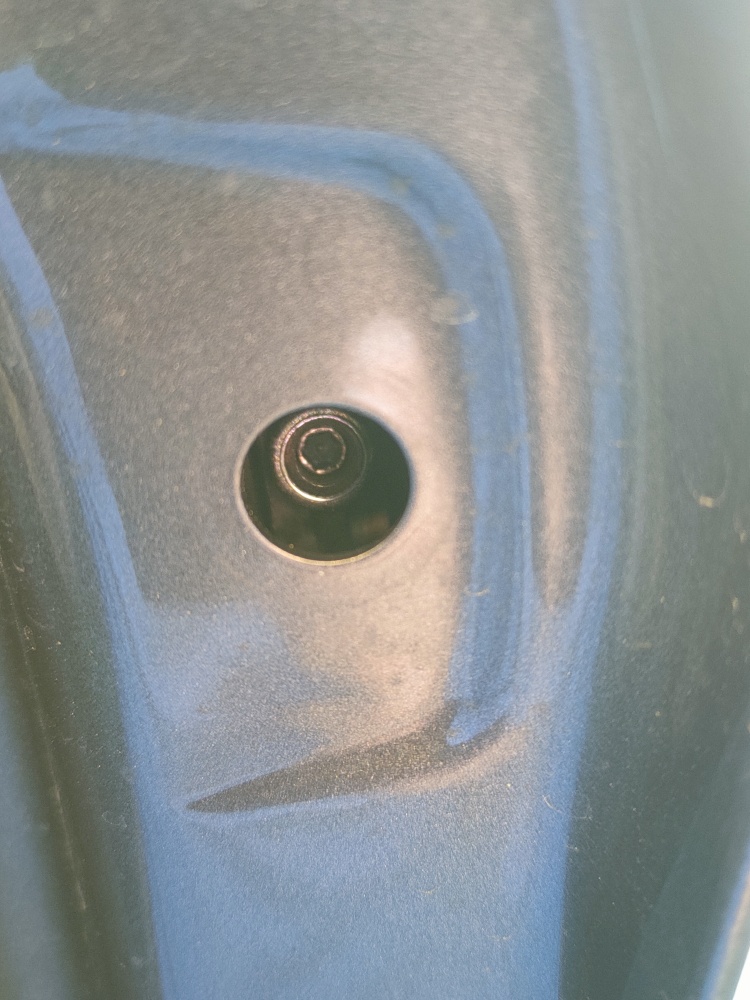 Na předních dveřích je ještě dvojice vrutů s křížovou hlavou ze zadního boku. Jeden pod krytkou: