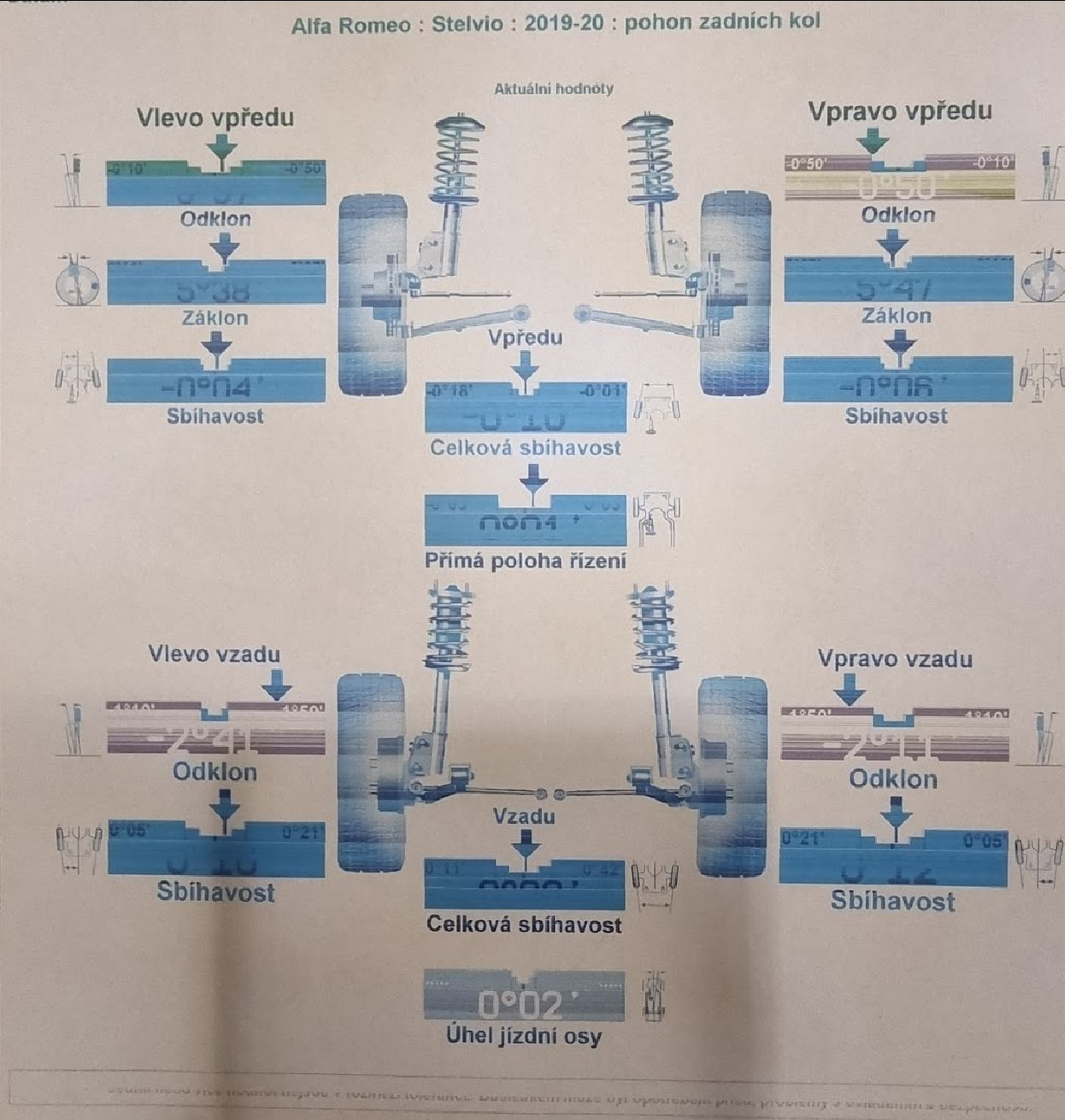 v tom protokole od geometrii nevidím Q4 ak mas Q4 tak ta ma trochu ine hodnoty ako stelvio RWD a tiez som pocul ze to v programe niektory na geometrii nemali a museli hodnoty od zohnat aby mohli nastavit na konktretne auto. ale mozes mat aj niektoré rameno ohnute, preto im to nemusi ist nastavit