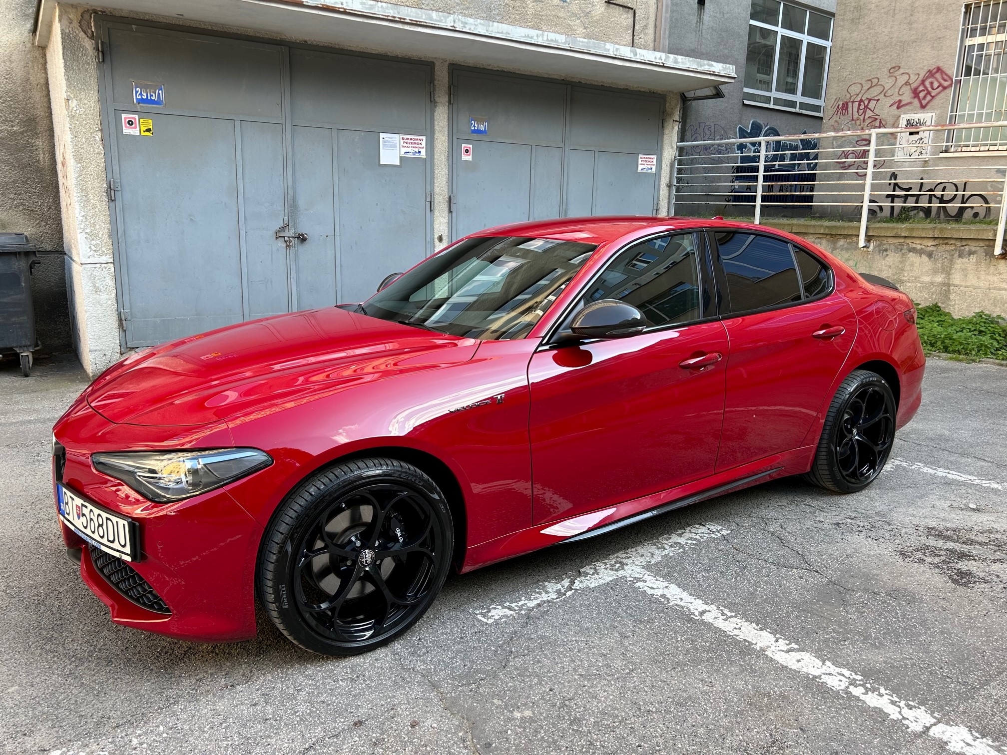 Od r. 2021 = AR Giulia Veloce MY 2021, 2,0 / 280 PS, karbónový paket ako QV + poťahy sedadiel a palubná doska v koži, červené prešívanie ako QV. Hneď som dokúpil výfuk Ragazzon s integrovanými elektricky ovládanými klapkami a koncovkami z uhlíkových vlákien. Bolo to perfektné auto, no predalo sa v r 2023, keďže som potreboval auto s väčším kufrom, nakoľko Giulia ako sedan ma vysoku nakladaciu hranu a vacsie veci sa do neho nakladaju komplikovane + tazko sa mi do neho nakladal bicykel. Bolo mi ho luto, a tak som ho radsej predal a zmenil svoje daily za ine vozidlo... Bolo predane do CZ. Verim ze majitel je stastny, nakolko som velky pedant a o auta sa staram velmi poctivo.