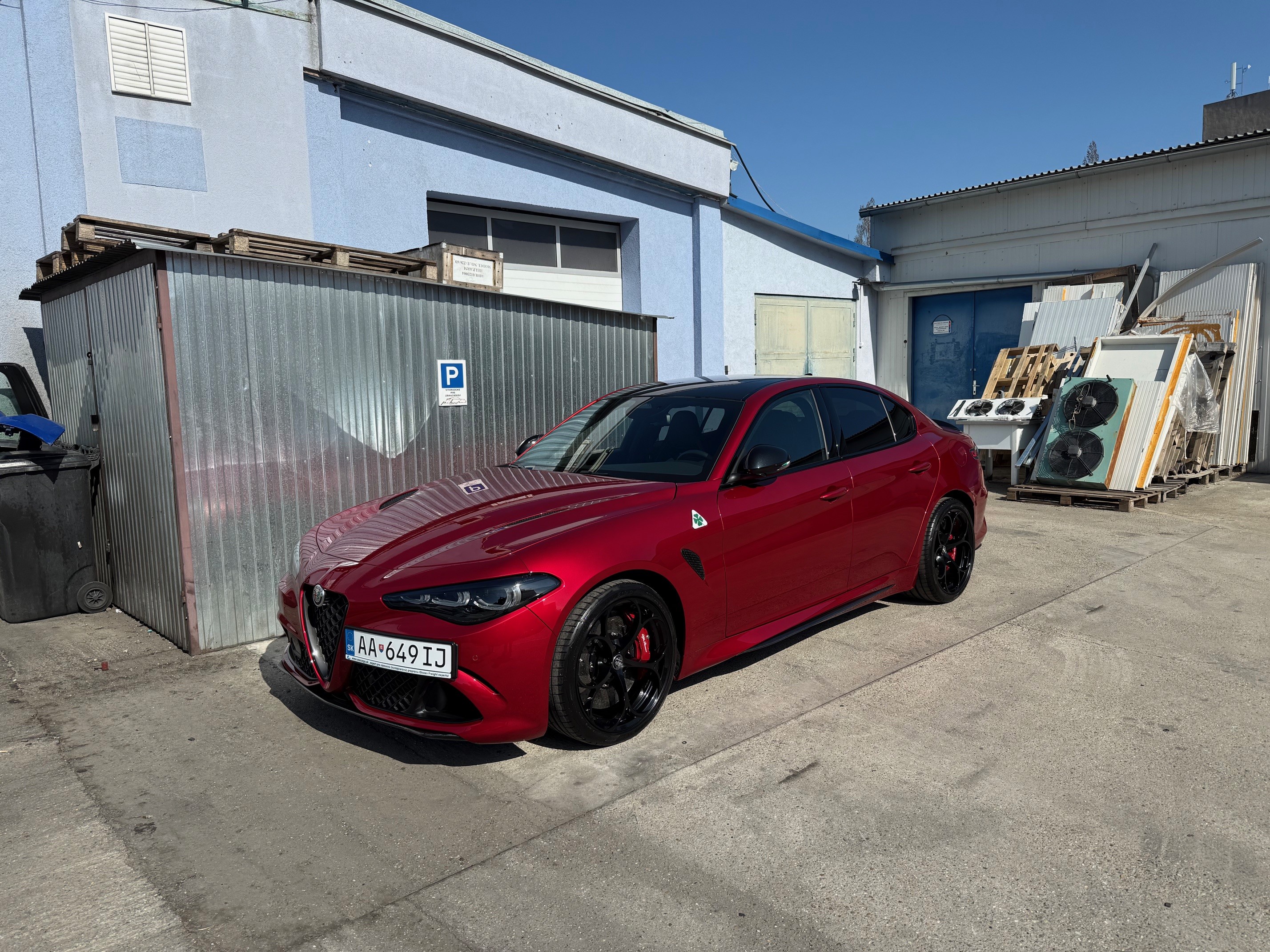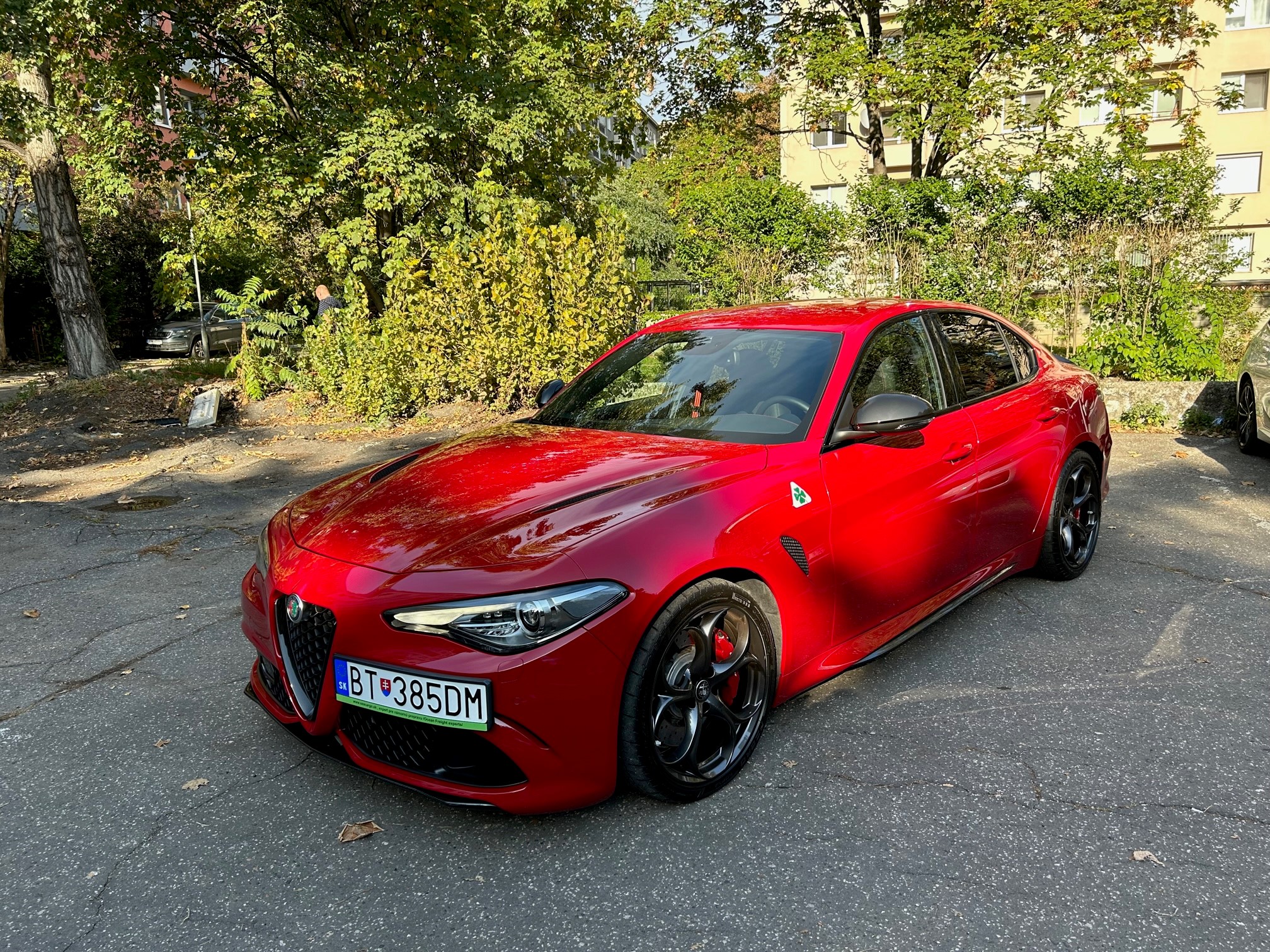 Víkendové auto – AR Giulia QV, MY 2022, kupovane v 02/22 v DE ako nove, predvadzacie vozidlo, ktore iba stalo v showroome a nejazdilo. Auto som jazdil bez úprav, dokupil som si iba 2. sadu kolies = kované disky NTM, štýl QV, originál veľkosť s o niečo menším ET... Auto som predal v lete 2023 taktiez do CZ, s majitelom som stale v kontakte, je to velmi fajn clovek a stastny majitel Giulie QV.