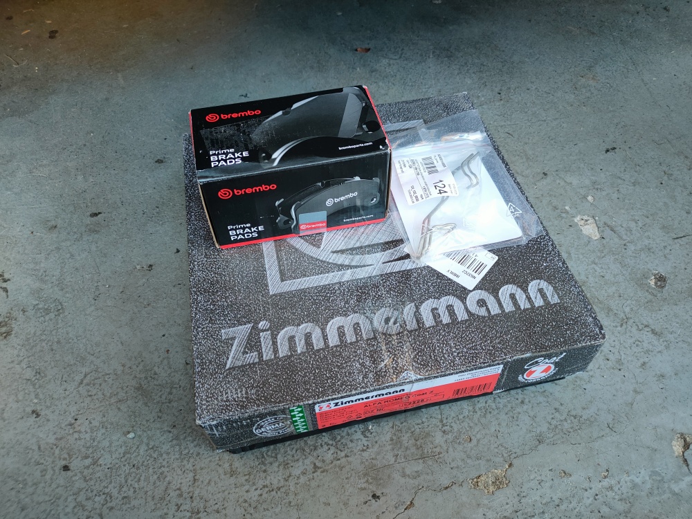 Nicméně, materiálu bylo ještě dost, ale byly teda slušně zapečený a zkorodovaný. Moc nechápu, kromě pár koleček na Kameni to jinak nějakou bídu nedostává. Tak jsem zvědavej, jak si budou vést ty nové. Desky Brembo jsem bral jen proto, že Zimmermann tyhle nedělá (nebyly). Vše okolo vyčištěno, včetně těch tepelných štítů, třmeny natřeny stříbrným Alkytonem, brzdiče "vyleštěny" dráťákem...