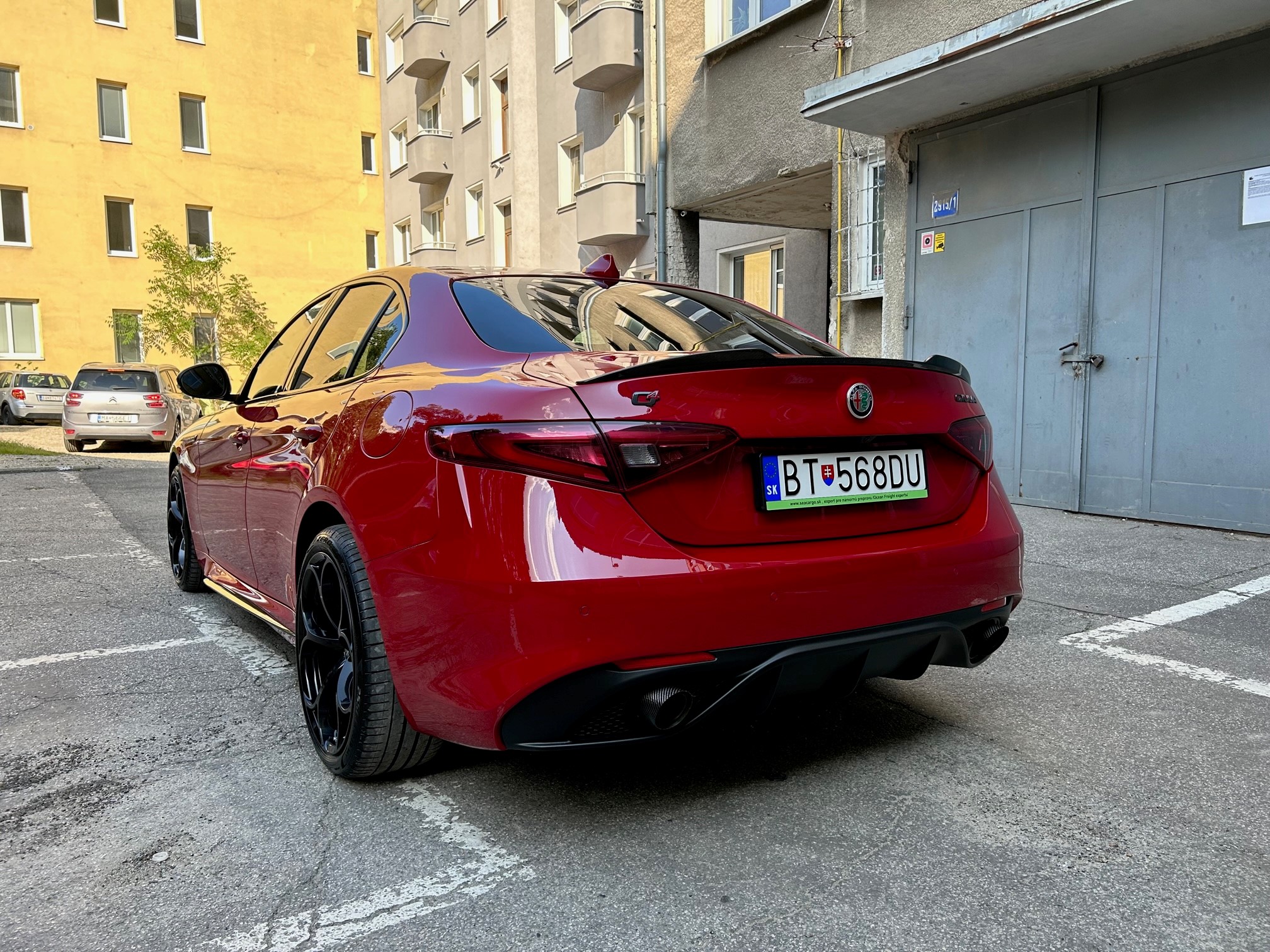 Víkendové auto – AR Giulia QV, MY 2022, kupovane v 02/22 v DE ako nove, predvadzacie vozidlo, ktore iba stalo v showroome a nejazdilo. Auto som jazdil bez úprav, dokupil som si iba 2. sadu kolies = kované disky NTM, štýl QV, originál veľkosť s o niečo menším ET... Auto som predal v lete 2023 taktiez do CZ, s majitelom som stale v kontakte, je to velmi fajn clovek a stastny majitel Giulie QV.