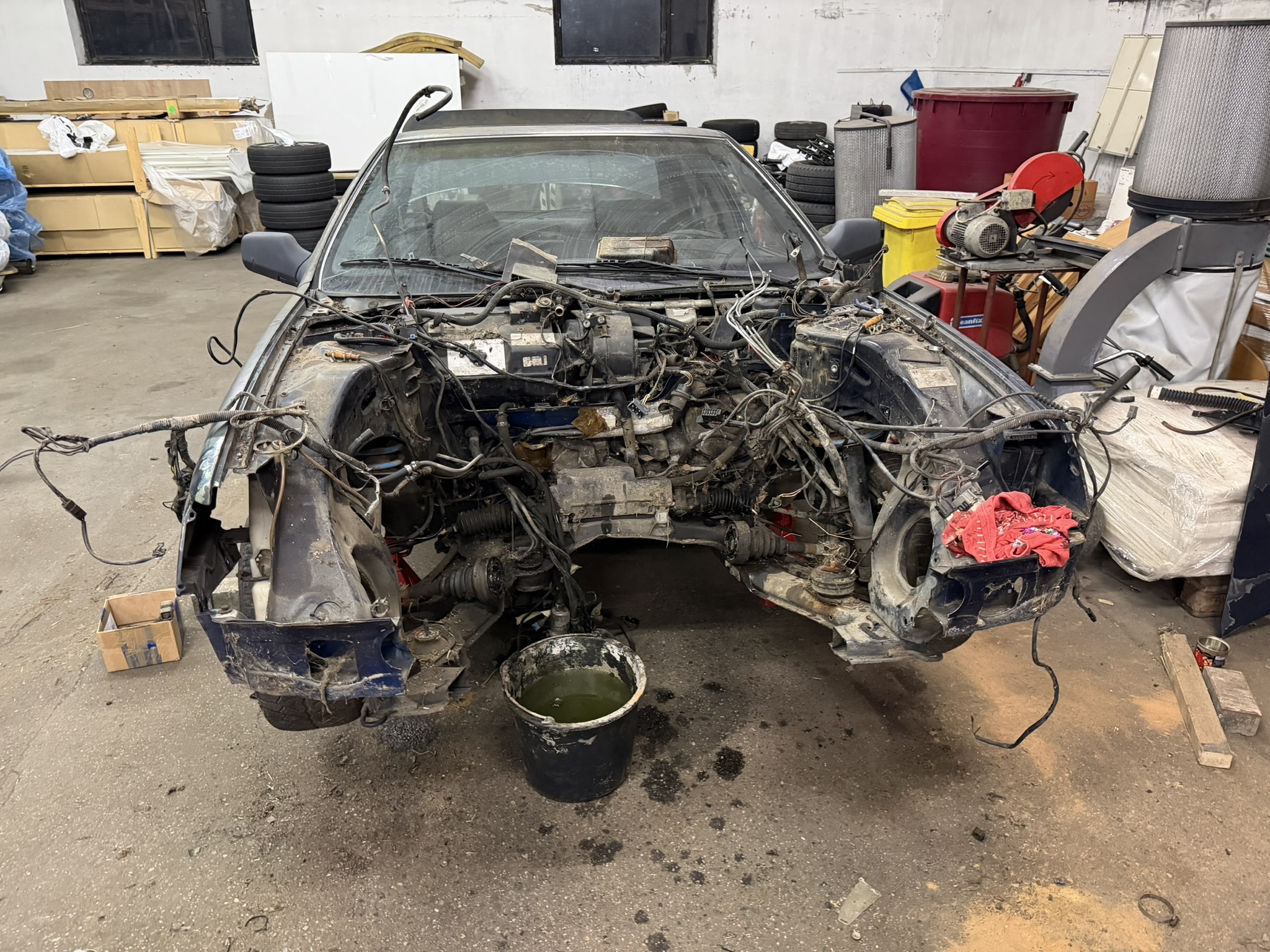 Aktuálně mám je fotky "před" a ty jsou docela děsivý. Motor vylepšený o záchodovou trubku, vybydlený interiér s myším hnízdem, domorobo oprava podběhů. Auto mělo z výroby klimatizaci, část klimy v interiéru je v pořádku, v motorovém prostoru naopak všechno chybí. Klimakompresor ani trubky nejsou. Ale motor jde protočit a karoserie kromě amaterské opravy podběhů vypadá zdravě. Nechybí ani plechové kryty podběhů vepředu a vzadu