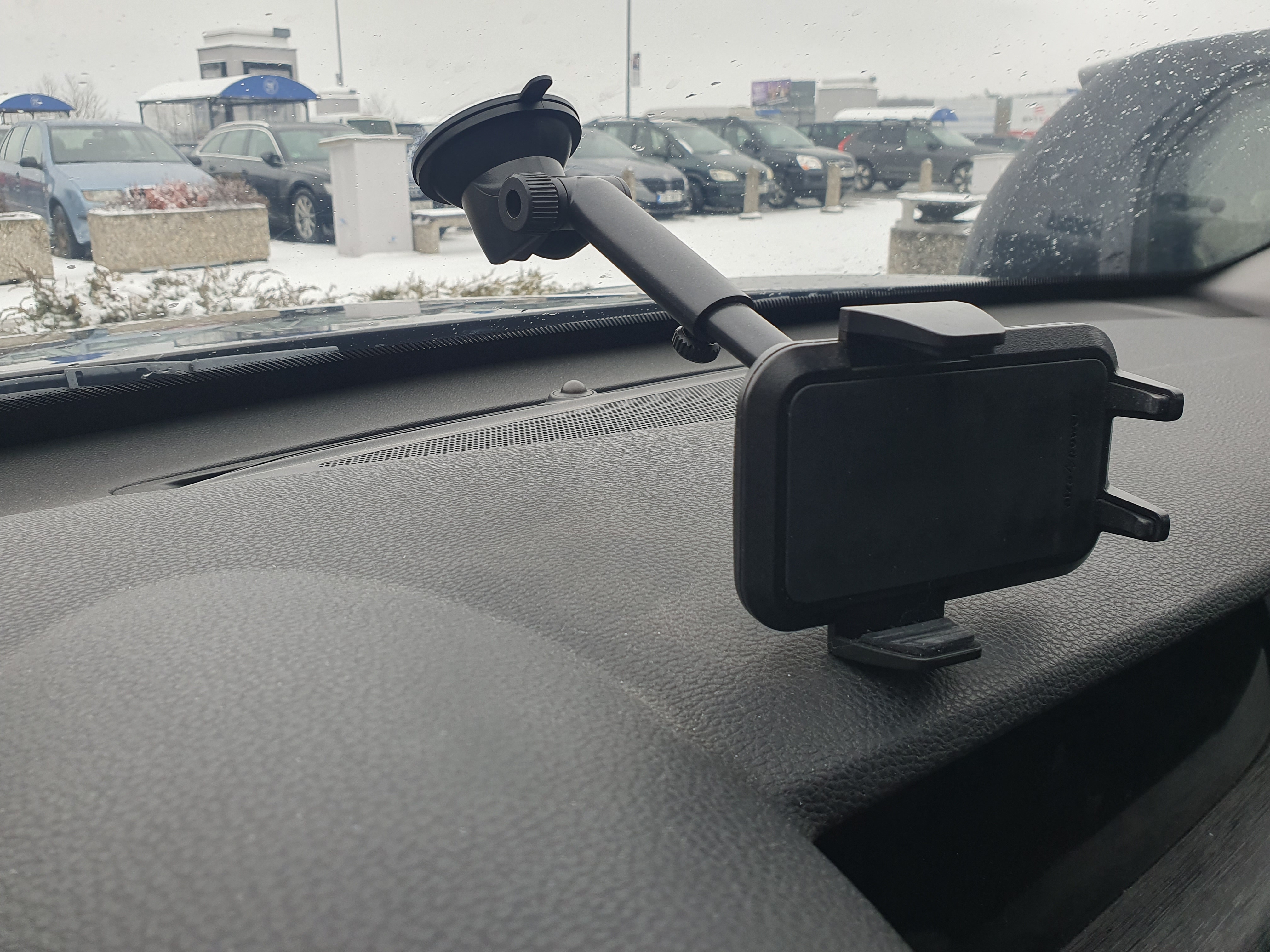 Trochu jsem tušil, že se zeptáš, tak jsem ti to i vyfotil. Na té gumě ke sklu je trochu lepkavý povrch, takže po přisátí drží dobře. Nicméně, když jsem to nechal jenom na té přísavce, telefon se trochu bincal. protože ta konzolka držáku je hodně dlouhá. Vyřešil jsem tak, že samotný držák mobilu jsem současně lehce opřel o palubku a je to dokonalý. Pohodlně na něj dosáhnu a při jízdě se nehne. :-)