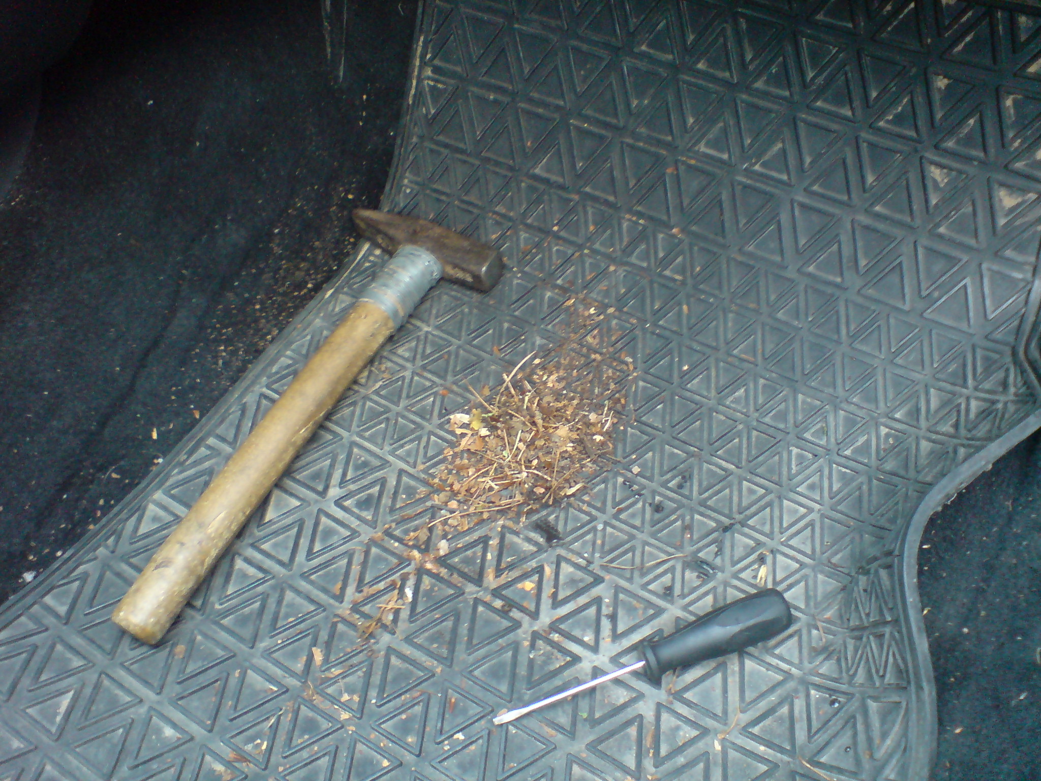 Tak hlavně klapka pouštějící vzduch na přední sklo na knoflík vůbec nereagovala a byla seklá v lehce pootevřené poloze.... řekl sem si no nic.... a pár chvaty za který by se nemusel stydět žádnej gynekolog či inseminátor skotu jsem klapku "demontoval" potažmo přelomil vejpůl a vytáhl. Nyní ofukuje sklo plnou silou perfektně.... dále mě štvalo neustálé chrastění při puštěném větráku a to, že z výdechů furt lítá jakýsi bordel. Inu napadlo mě odpojit hadici co vede z topení pod auto a slouží k odtoku vody co se do topení může dostat. Tato hadice byla plná listí a podobného bordelu.... to jsem prošťouchl.... ale pravý překvápko bylo v topení samotným... viz. fotka na které toho je jen zlomek. Jinak celkem toho byly dvě hrsti... a dostával jsem to ven přes dotyčný odtokový otvor o průměru cca 1.5cm tak, že jsem střídavě pouštěl větrák a do skříně topení zespod bouchal kladivem