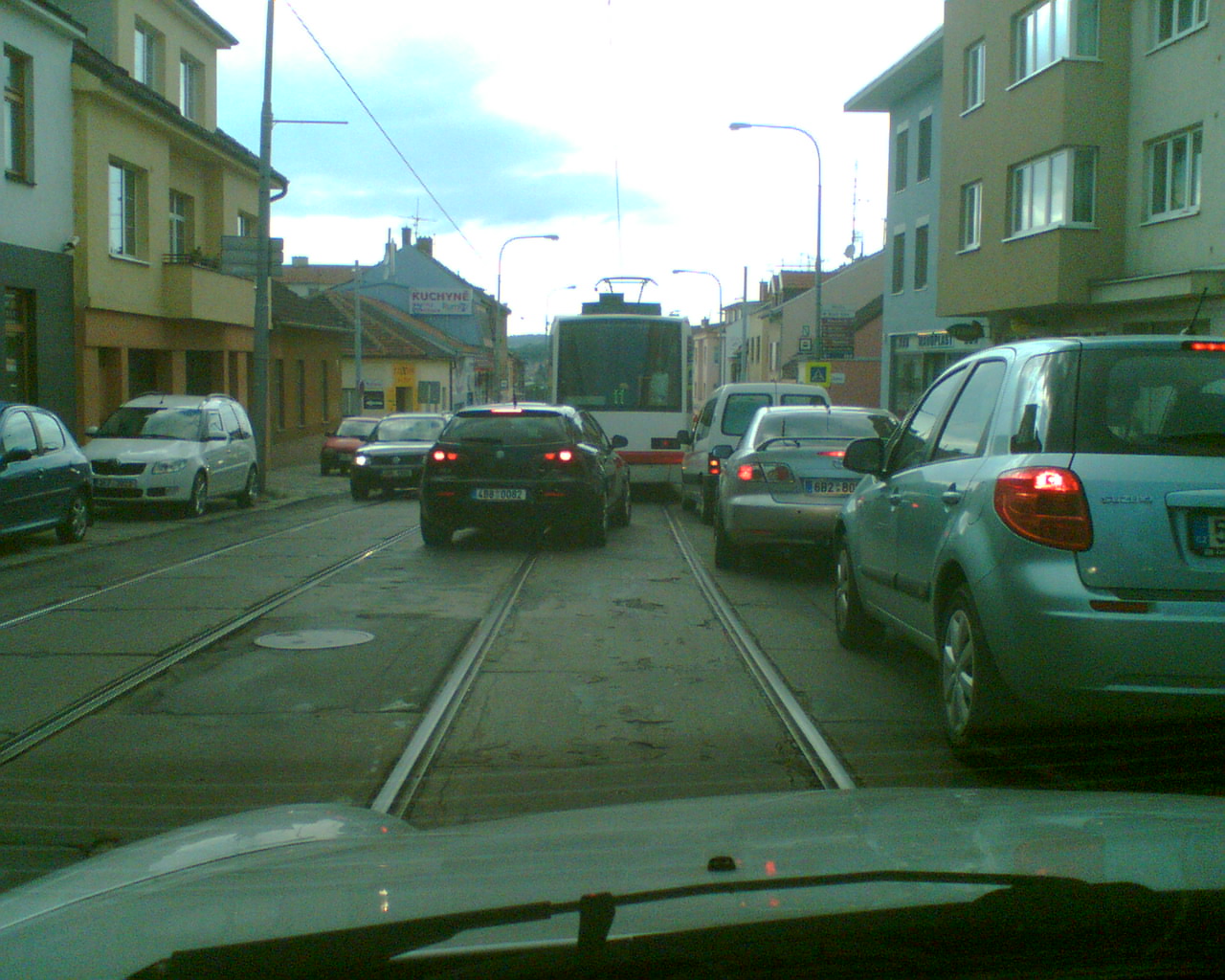 Jenže o 200 metrů později začal předjíždět na úplně přeplněné ulici, kde se navíc jezdí po tramvajových kolejích a na ulici je vcelku solidní kopec. Nejprve se málem srazil s protijedoucí tramvají, která kvůli němu musela prudce zabrzdit (naštěstí do kopce). Vzápětí se pokusil objet tramvaj stojící v zastávce v místě, kde v protisměru není pruh pro auta (jezdí se po kolejích), hned za zastávkou je přechod, po kterém přecházejí nic netuše ti lidé z tramvaje (kdo by se díval do protisměru za tramvaj, že) a ještě je tam hned křižovatka! Něco tam jelo, takže to nakonec vzdal a nahrubo se namáčkl mezi čekající auta. Takového dementa se nedá nevyfotit. Tohle je to místo, kde chtěl předjíždět tu tramvaj