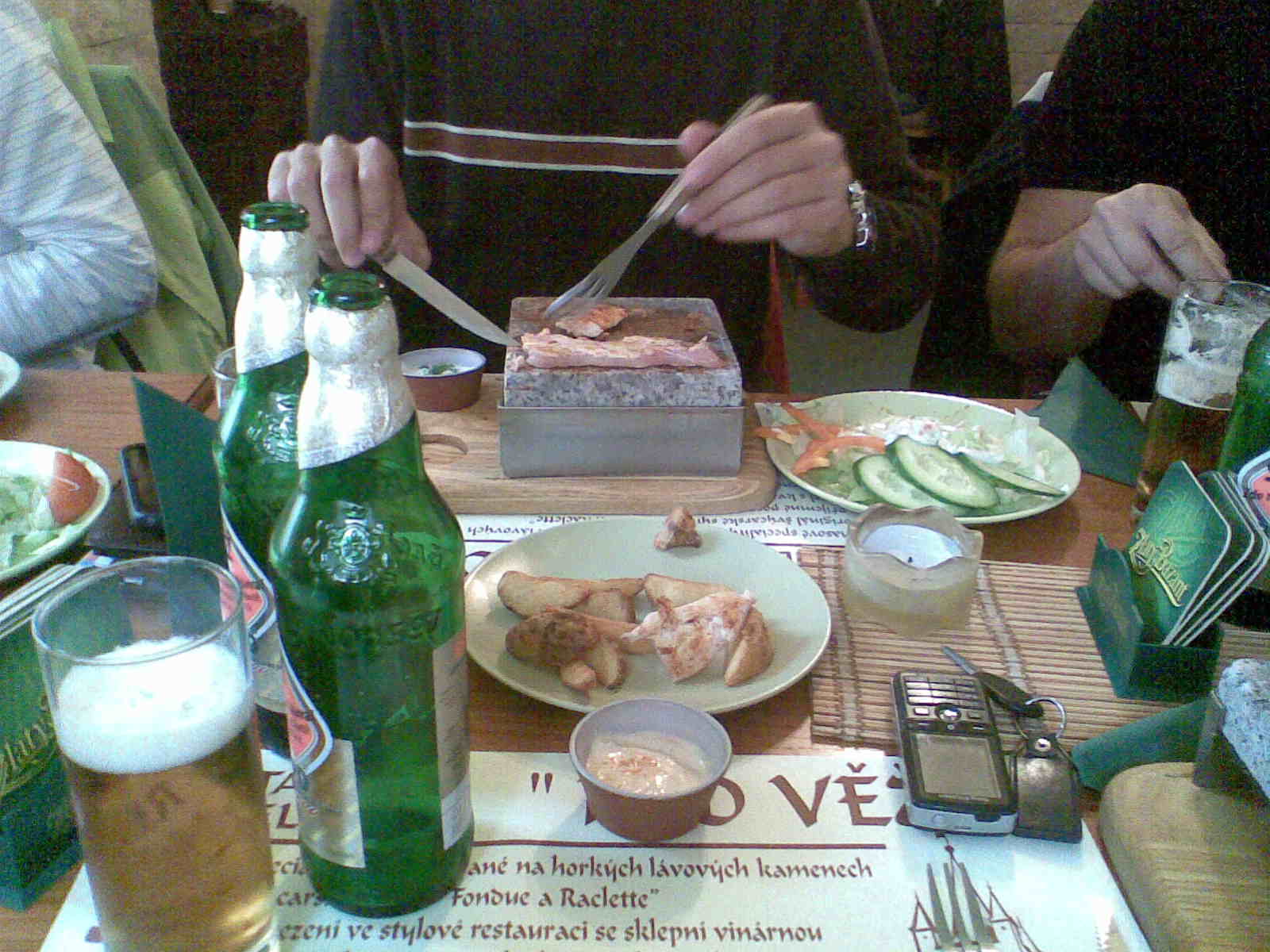 bylo to takové zajímavé jídlo, jednoduše tam číšník přinesl sirovou flákotu a k tomu rozpálenej kámen z pece a následně si to člověk musel ukuchtit sám