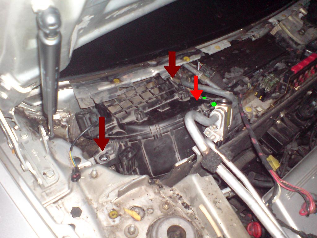 Takže, konečně po skoro dvou měsících foukám a topim...myslel jsem že nejhorší jsem měl za sebou když jsem to šrouboval ven...dát to zpátky je ježek v kleci na druhou, každopádně postup zde...větrák spolu se sánim vzduchu drží na třech šroubcích (na obrázku jsou šipky, snad k tomu nebude potřeba legenda a poberete to...) jsou tam dva otvory pro nasávání (zvenku a z interiéru) a jeden výdech. výdech (zelenej obrys) je přišroubovanej samořeznýma šroubkama k topení a klimě. celý to zakrývala folie která při montáži vzala za svý, vzhledem k tomu že je jen přilepená na nějakym silikonu tak ji radši sundejte ať jí nemusíte nahrazovat něčim jinym jako já....asi nejvíc vadí hliníkový trubky vedoucí do klimy, nevim jestli je možný je někde odšroubovat, já jsem je trochu silou vyhnul nahoru a pak je zase po tom co se tam větráček uprdelil nějak naohybal