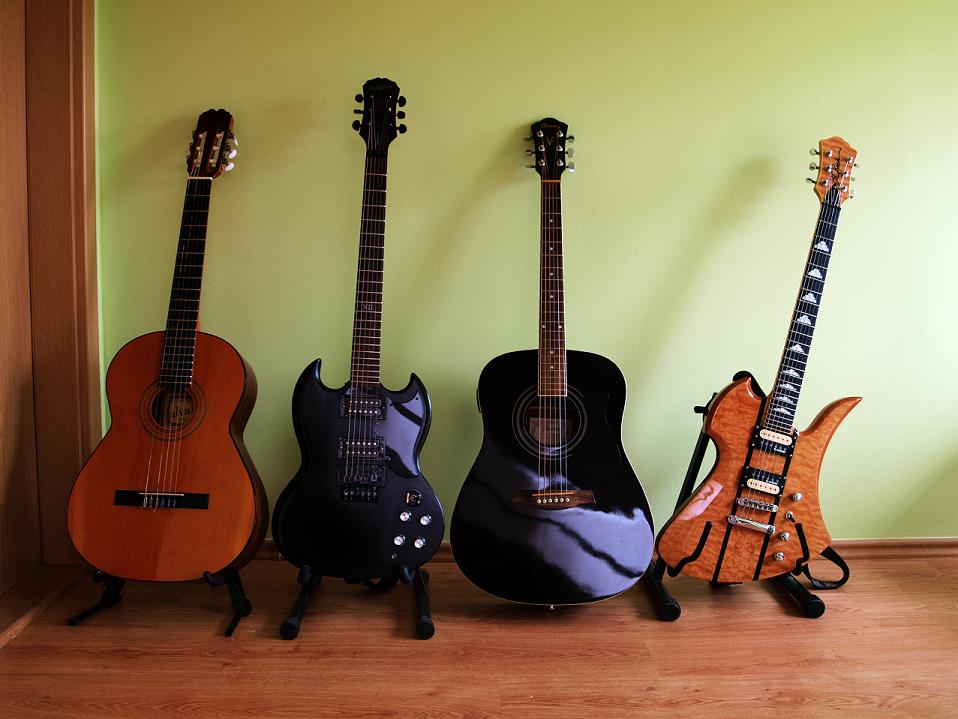 I když se možná zdá, že těch kytar je hodně, není tomu tak. Každá hraje jinak a má jiné vlastnosti. První je klasická kytara s nylonovýma strunama, tlustším krkem a hraje se na ní klasická hudba, s tou jsem začínal v hudebce, bohužel na ní dneska už moc nehraju a struny by potřebovala vyměnit jako sůl :/ Další je SG od Epiphone a má Floyd Rose tremolo, popravdě když sem jí kupoval, říkal jsem si, že tremolo bude fajn, ale vůbec ho nepoužívám a kdyby tam nebylo, kytara by měla lepší dozvuk a samotnej zvuk, ale mám ji rád, zvuk má díky slabšímu tělu ostřejší a je dost agresivní, a je neskutečně lehká, dobrá na punk