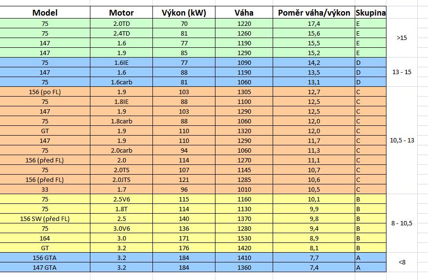 Já dám update za AR 159 specifikací, jaké mají jejich "zdejší" majitelé (pokud vůbec nějaká pojede...). Spočítal jsem to i odděleně za Sedany a Sportwagony, které váží vždy o cca 50 kg víc, ale ten rozdíl v zařazení do tříd nakonec nehrál roli. Jde o data před faceliftem (2008), ale ani po něm to na zařazení do tříd nic moc nemění: