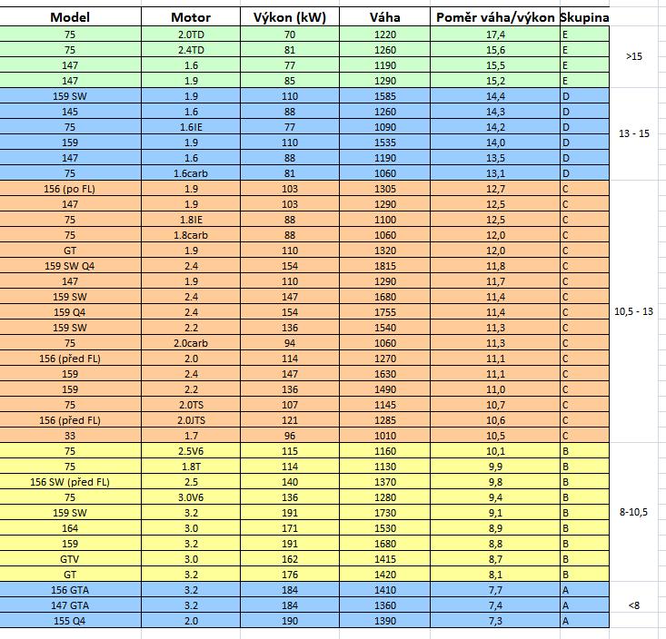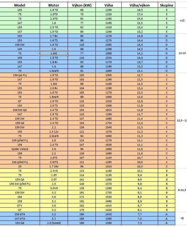 Já dám update za AR 159 specifikací, jaké mají jejich "zdejší" majitelé (pokud vůbec nějaká pojede...). Spočítal jsem to i odděleně za Sedany a Sportwagony, které váží vždy o cca 50 kg víc, ale ten rozdíl v zařazení do tříd nakonec nehrál roli. Jde o data před faceliftem (2008), ale ani po něm to na zařazení do tříd nic moc nemění: