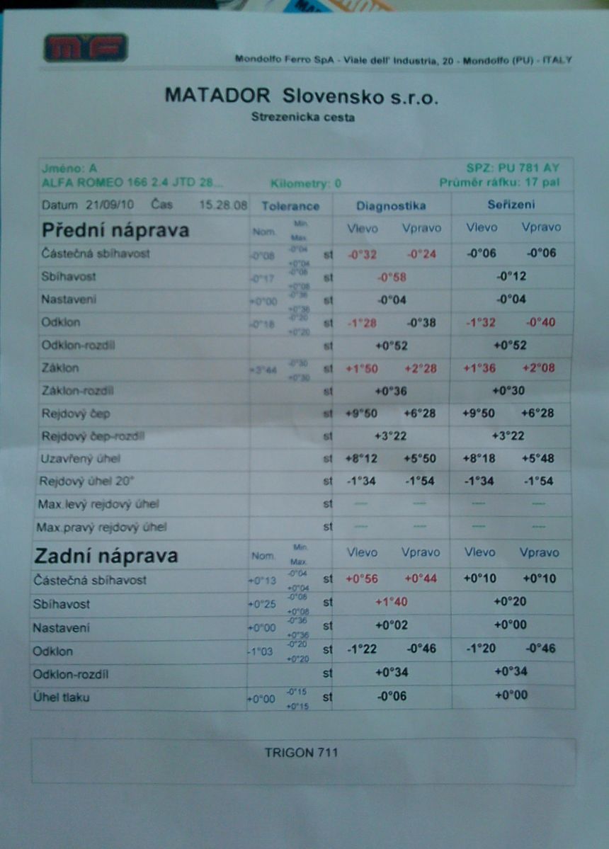 Kolegovia potrebujem surne radu.Stalo sa s cim som ani vo sne nepocital.Alfa bola v servise vymenili sa unibaly zadnej tehlice +gumy na stabilizatore a urobila sa geometria.Ked som sadol do auta jednoducho auto sa nedalo ovladat.Zadna naprava tahala do stran.Poriadne to plavalo,skoro ma vyhodilo z cesty.V servise skontrolovali celu napravu nema ziadnu volu.Prikladam dokument geometrie.V servise tvrdia ze su to tlmice ale tomu neverim ved to auto jazdilo v pohode.Akurat buchal stabilizator.Mozete poradit.SURNE!!!!!!!!!!!!!!!!!!!!!!!!!!!!