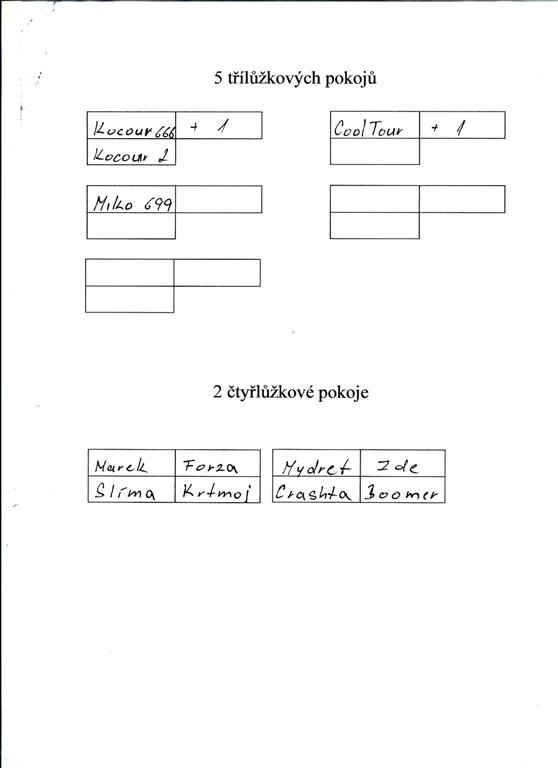 Takže,dvoulůžkové pokoje jsou už zaplněny,volné jsou,5x třilůžko a 1x čtyřlůžko, některý den po neděli tady hodím ubytovací chlívečky ke kterým se můžete vyjádřit jestli to tak vyhovuje či ne,popřípadě se to dá ještě nějak podle potřeby změnit :smt023